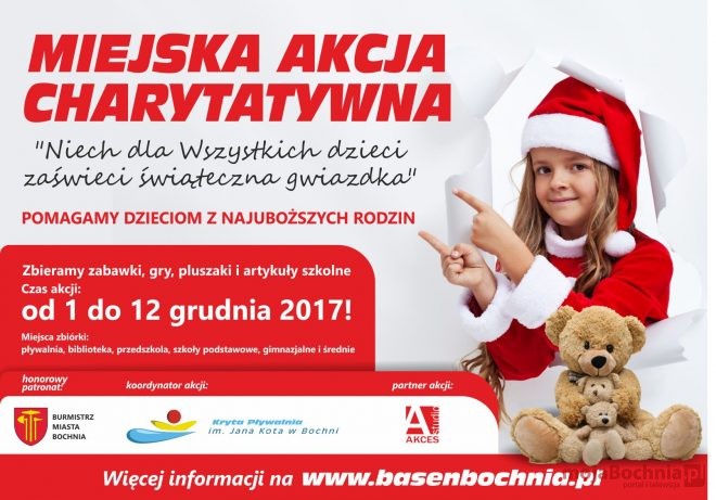 W Bochni trwa kolejna świąteczna akcja charytatywna. Dla dzieci z ubogich rodzin są zbierane zabawki, pluszaki, artykuły papiernicze, książki i inne dary serca. Można je zostawiać na basenie w pojemniku wystawionym w holu, a także w przedszkolach, szkołach i bibliotekach na terenie miasta.