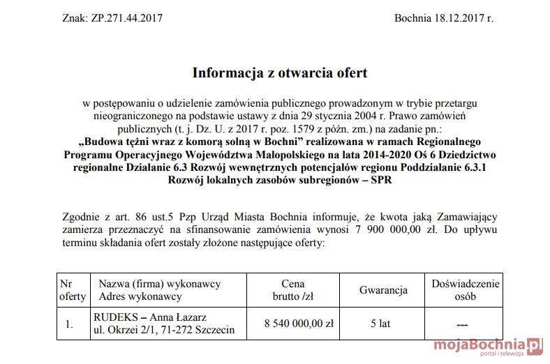 Bochnia dostała na budowę tężni solankowej 3,7 mln zł dotacji z Unii Europejskiej. Pierwotnie przecięcie wstęgi planowano przed wyborami, ale ze względu na problemy ze znalezieniem wykonawcy, magistrat dostał zgodę na wydłużenie okresu budowy o prawie rok.