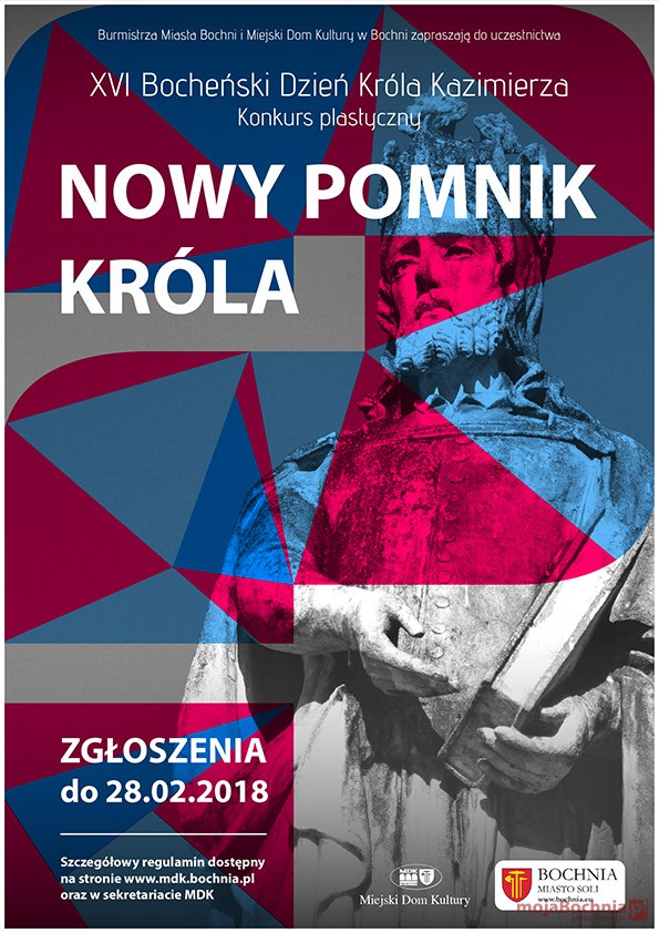 Z okazji Bocheńskiego Dnia Króla Kazimierza Burmistrz Bochni oraz Miejski Dom Kultury ogłaszają konkurs plastyczny dla uczniów bocheńskich szkół podstawowych i klas gimnazjalnych pt. „Nowy pomnik Króla”.
