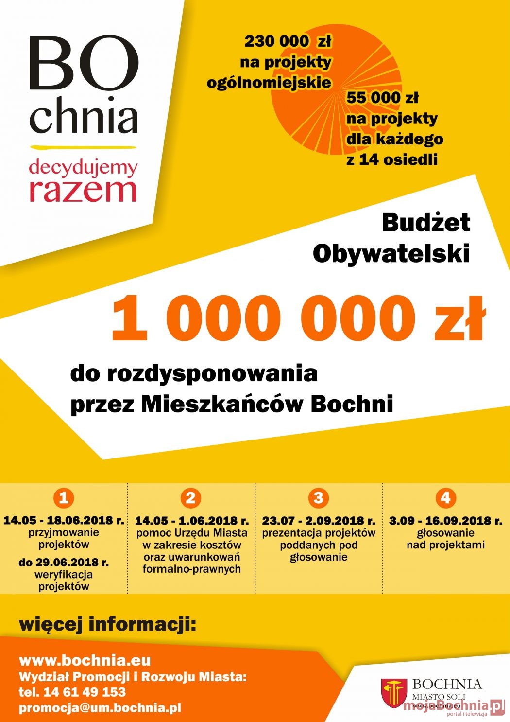 14 maja ruszy nabór projektów w ramach Budżetu Obywatelskiego Bochni na 2018 r. Do rozdysponowania będzie 230 000 zł na projekty ogólnomiejskie oraz 770 000 zł na projekty osiedlowe – 55 tys zł. na osiedle.
