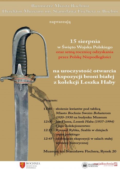 Z okazji 98 rocznicy bitwy warszawskiej, a tym samym także święta Wojska Polskiego, w Bochni odbędą się uroczystości, które nawiązywać będą również do setnej rocznicy odzyskania przez Polskę Niepodległości. W programie przewidziano złożenie kwiatów pod tablica Miasto Bochnia Swoim Bohaterom 1920-1930 na budynku Muzeum, później Jan Flasza opowie o Leszku Habie i jego kolekcjonerstwie. Ryszard Rabka przedstawi rolę szabli w dziejach polskiego oręża, a na koniec zostanie odsłonięta ekspozycja w salach stałej wystawy historycznej.
