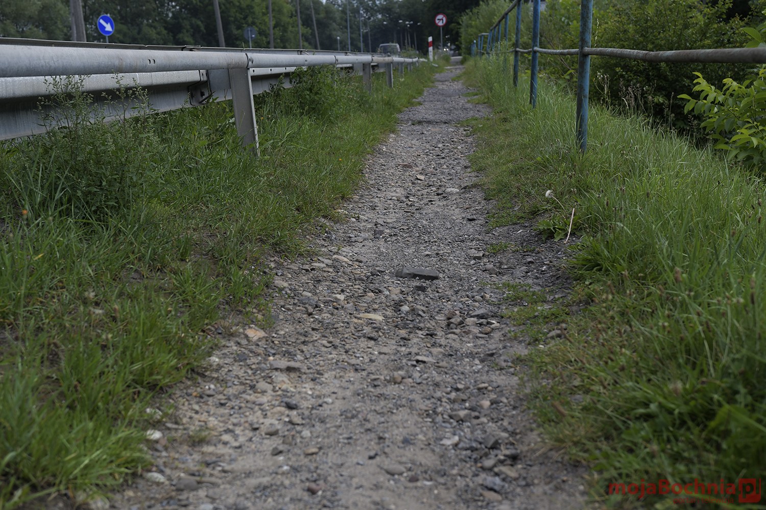 Mniej więcej rok temu poczyniliśmy artykuł na temat chodnika przy ulicy Wiśnickiej. Na odcinku pomiędzy drukarnią a wiaduktem nad obwodnicą piesi mają do pokonania wąski odcinek … no właśnie nie wiadomo czego – na pewno nie chodnika – na którym aż roi się od dziur, wystających kamieni, a także pozostałości po metalowych konstrukcjach.