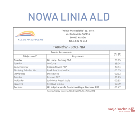 Koleje Małopolskie od dnia 6 kwietnia 2021 r. rozszerzyły sieć Autobusowych Linii Dowozowych o nową linię: ALD 6 Tarnów – Bochnia.