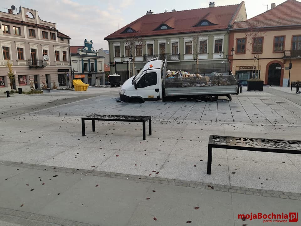 Do niecodziennego zdarzenia doszło dzisiaj na płycie Rynku w Bochni. Samochód zbierający śmieci wjechał w miejsce, gdzie znajduje się nowo oddana do użytku fontanna. Efekt można zobaczyć na zdjęciach przesłanych nam przez czytelnika.