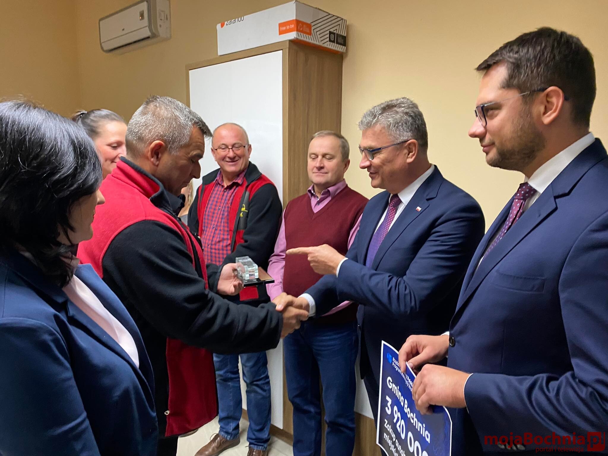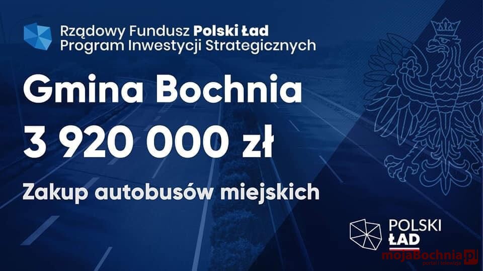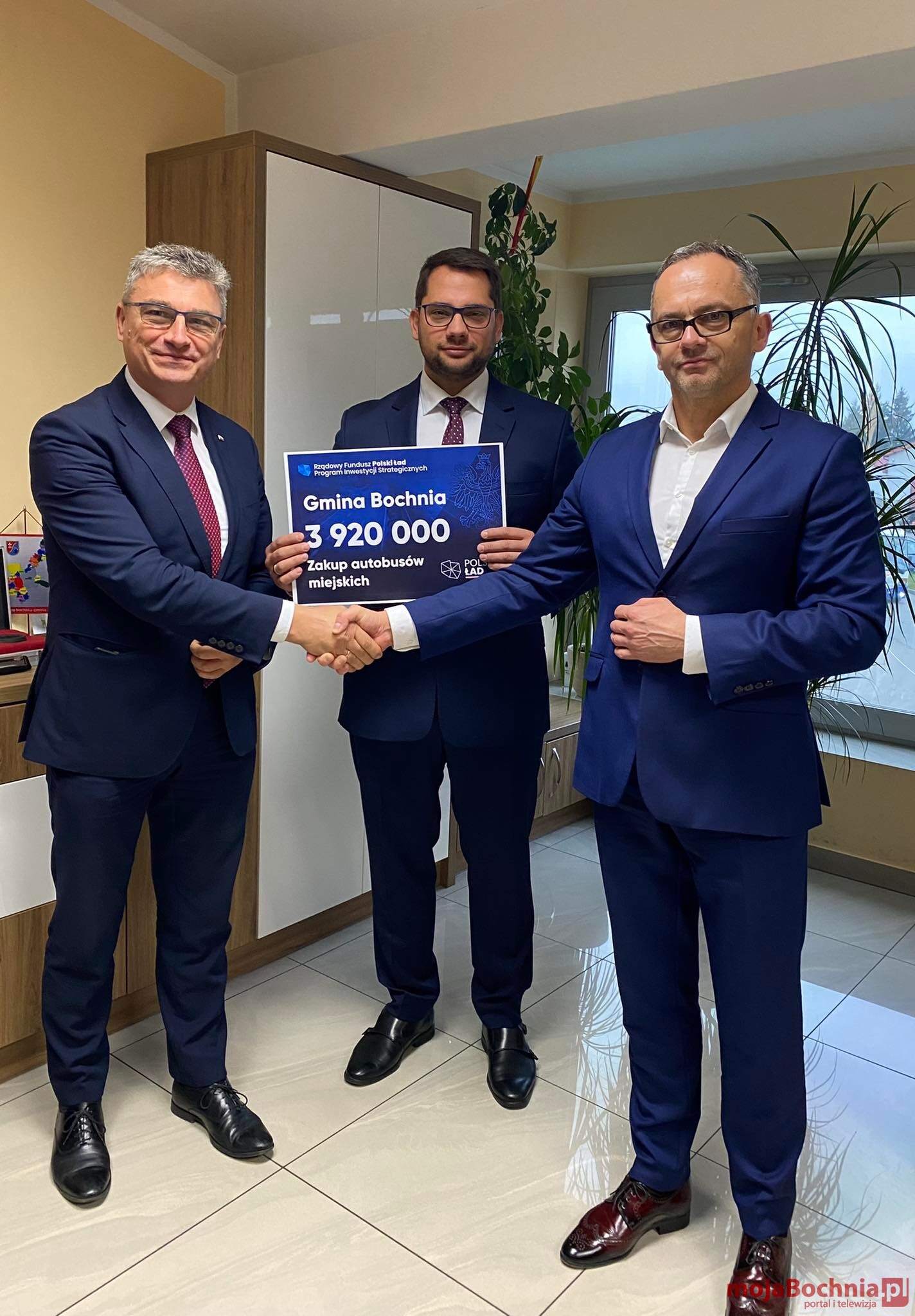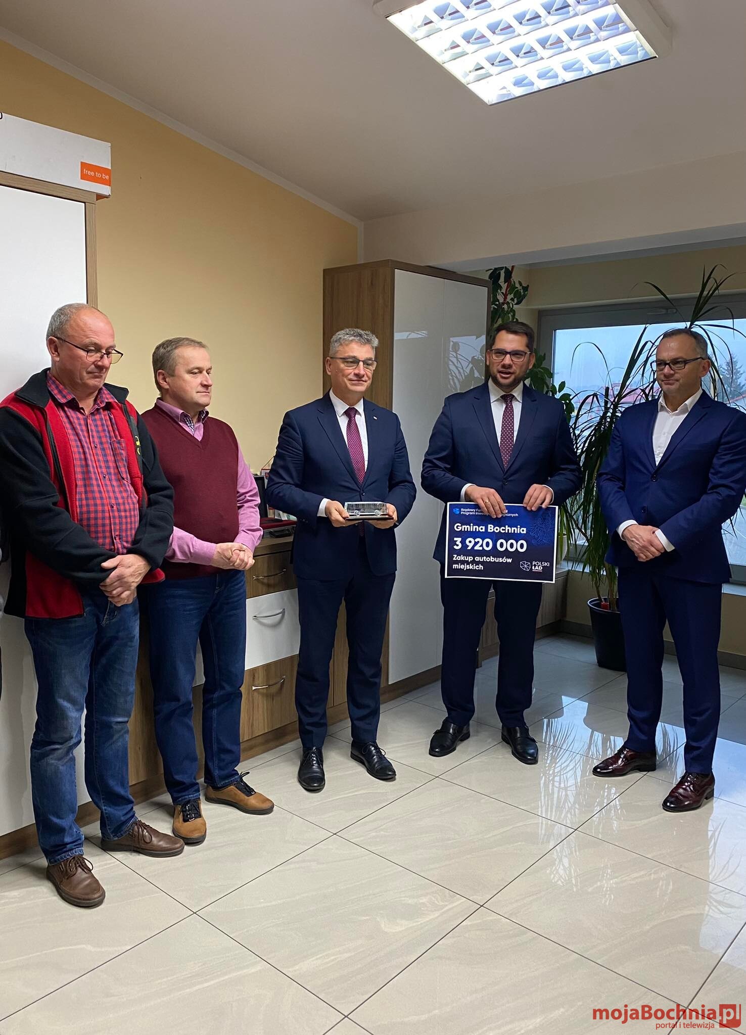 Poseł na Sejm RP Wiesław Krajewski wraz z Mariuszem Zającem Radnym Rady Powiatu Bocheńskiego, podczas roboczej wizyty w Rejonowym Przedsiębiorstwie Komunikacyjnym sp. z o.o. przekazali na ręce wójta Gminy Bochnia Marka Bzdeka, w obecności pracowników Spółki, symboliczny czek o wartości 3 920 000 zł na zakup nowych autobusów z Rządowego Funduszu Polski Ład. Zgodnie ze złożonym wnioskiem Gmina planuje zakupić aż siedem autobusów. Łącznie na ten cel zostanie przeznaczonych 5 mln złotych. Pozostała kwota tj. 1 080 000 zł pochodzić będzie z budżetu Gminy Bochnia.
