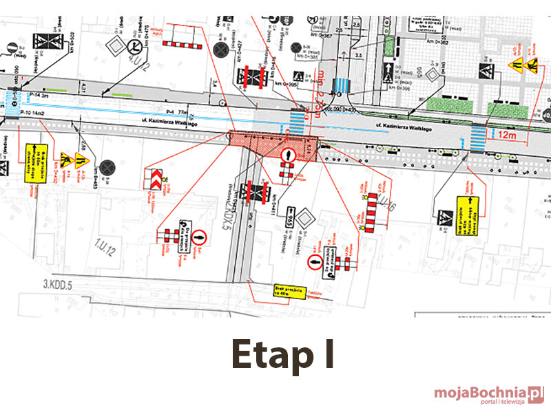 W trakcie etapu nr 1 (od strony DH ZENIT) wykonane zostaną prace po południowej stronie ulicy Kazimierza Wielkiego. Chodnik w miejscu robót zostanie wygrodzony i aby przejść dalej trzeba będzie skorzystać z sąsiednich przejść i drugą stroną drogi dotrzeć w pożądane miejsce. Wszystko zostanie odpowiednio oznakowane tak jak w opracowanym projekcie.