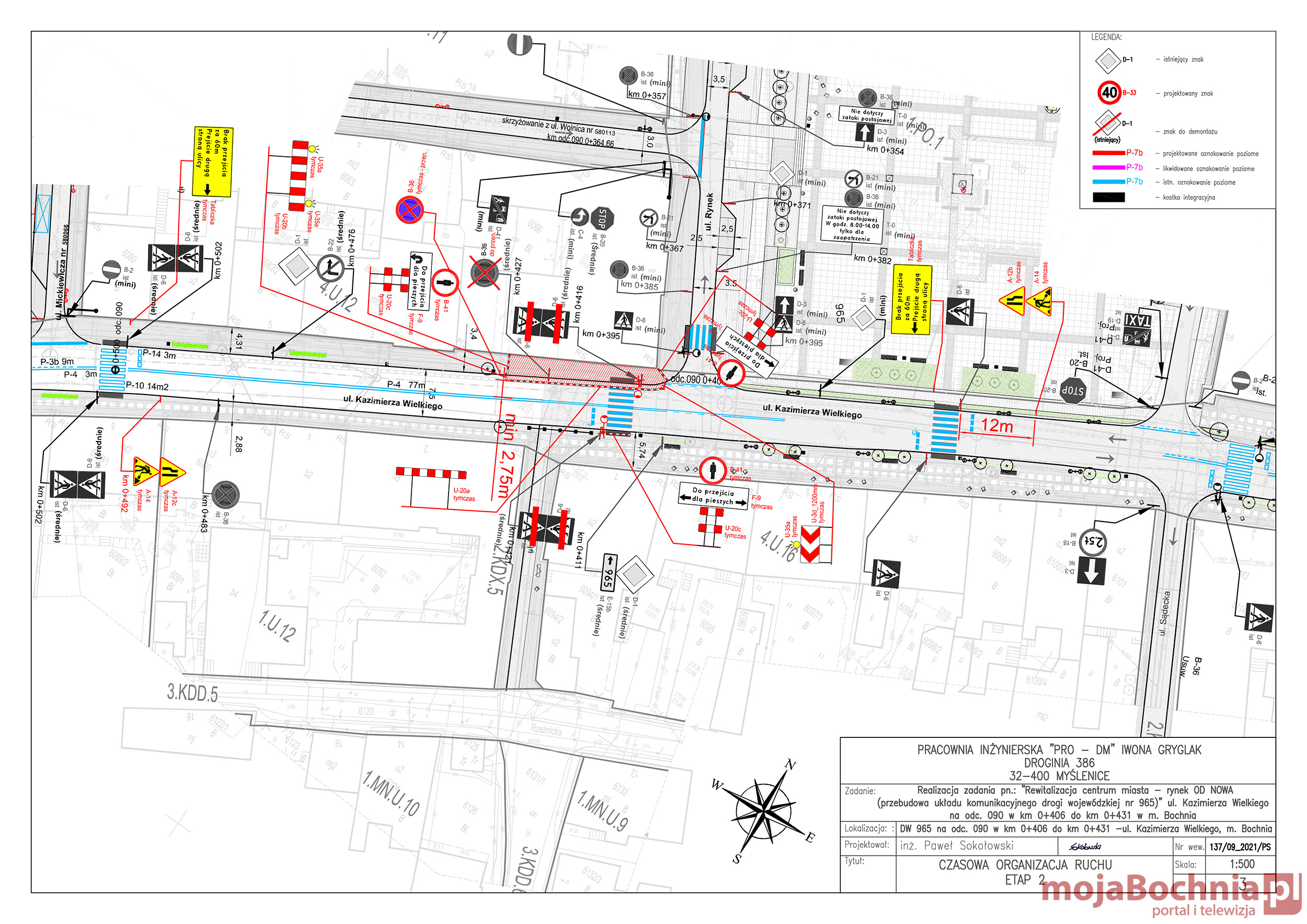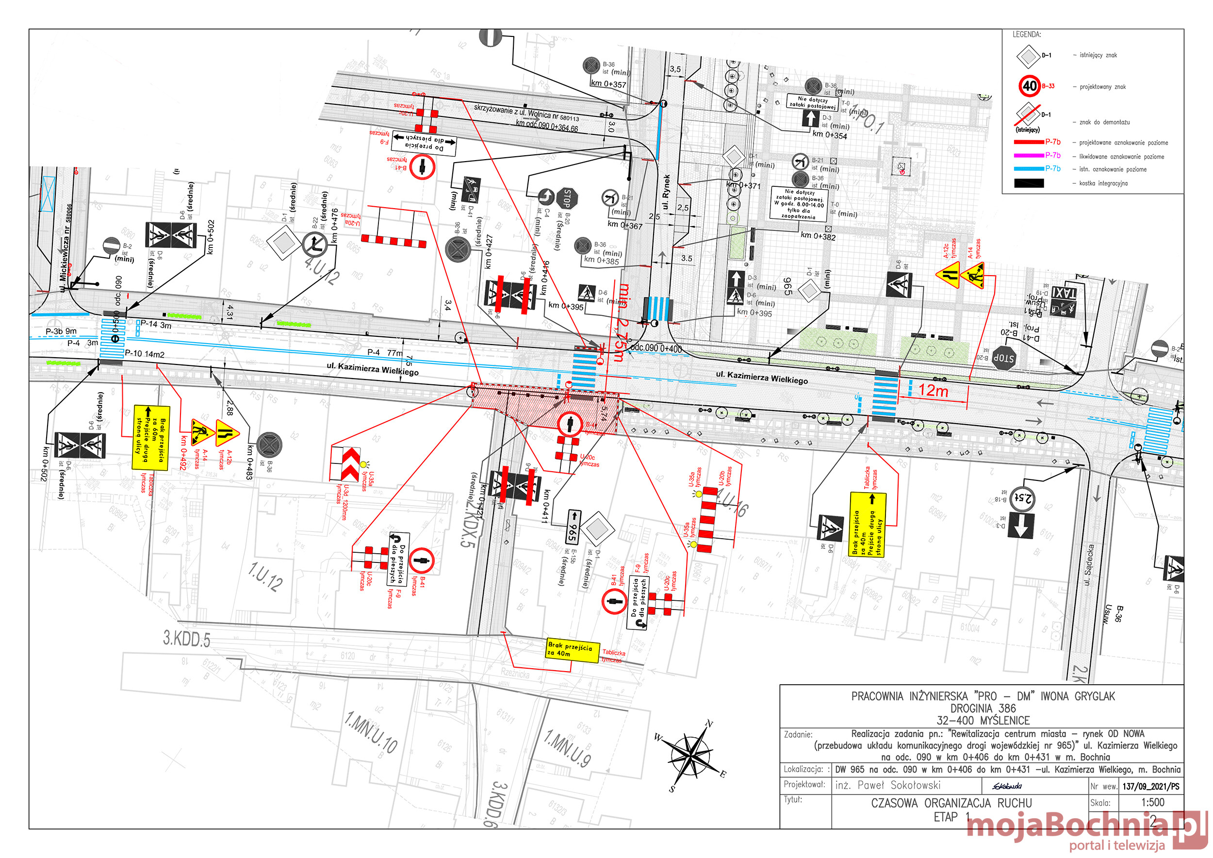 Z dniem 22 listopada 2021r. w związku przebudową chodnika, zostaje wprowadzona tymczasowa organizacja ruchu na ul. Kazimierza Wielkiego pomiędzy ul. Kącik a Rynkiem. Roboty wykonywane będą przy całkowitym zajęciu chodnika i fragmentu jezdni.
