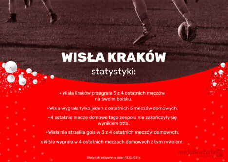 W ostatnim meczu Wisła Kraków przegrała na wyjeździe z Zagłębiem Lubin. Spory wpływ na losy tej rywalizacji miała czerwona kartka, którą otrzymał stoper Białej Gwiazdy na początku meczu. Wisła wyszła w Lubinie na prowadzenie, jednak nie potrafiła go utrzymać do końca rywalizacji. Statystyki wskazują, że Wiślacy mają na koncie już 6 kolejnych meczów, w których stracili przynajmniej jednego gola. Podczas zimowej przerwy bez wątpienia ta drużyna będzie musiała popracować nad aspektem gry defensywnej, ponieważ w innym przypadku sama zapisze się do walki o utrzymanie w rundzie wiosennej.