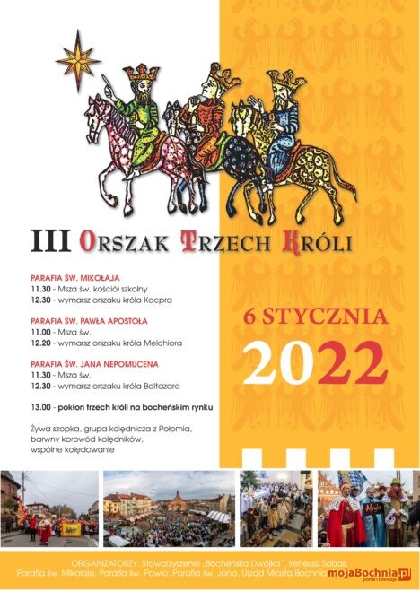Liczymy, że w czwartek 6 stycznia 2022 r. ulice Solnego Grodu zaroją się od barwnie ubranych uczestników orszaków – gdyż zgodnie z tradycją z trzech bocheńskich parafii wyjdą osobne orszaki, które spotkają się na rynku.