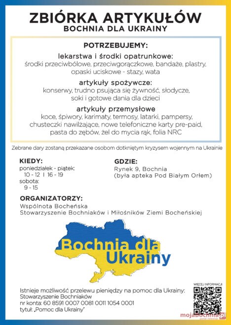 Stowarzyszenie Bochniaków i Miłośników Ziemi Bocheńskiej organizuje zbiórkę dla osób dotkniętych wojną na Ukrainie. Zbiórka odbywa się od poniedziałku do soboty.