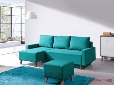 Z czym się komponuje turkusowa kanapa do salonu? Przede wszystkim pięknie przełamuje biel, a także beże i odcienie ecru. Dobry duet stanowi również z szarością, szczególnie z intensywnym wybawieniem grafitu.