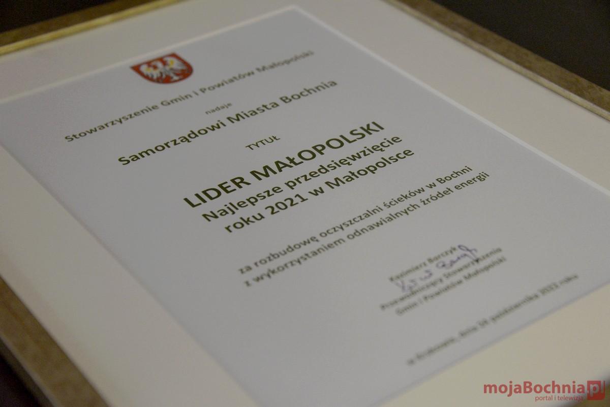24 października w Auli Akademii Górniczo-Hutniczej w Krakowie odbyło się uroczyste wręczenie wyróżnień za najlepsze przedsięwzięcie roku w Małopolsce. Tytuł LIDERA MAŁOPOLSKI 2021 przyznany został Samorządowi Miasta Bochnia za rozbudowę oczyszczalni ścieków z wykorzystaniem odnawialnych źródeł energii.