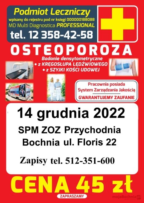 W środę 14 grudnia przy przychodni miejskiej przy ulicy Floris w Bochni pojawi się mobilna pracownia densytometryczna – Osteobus. Wykonywanie w niej będą badania kości w kierunku osteoporozy.
