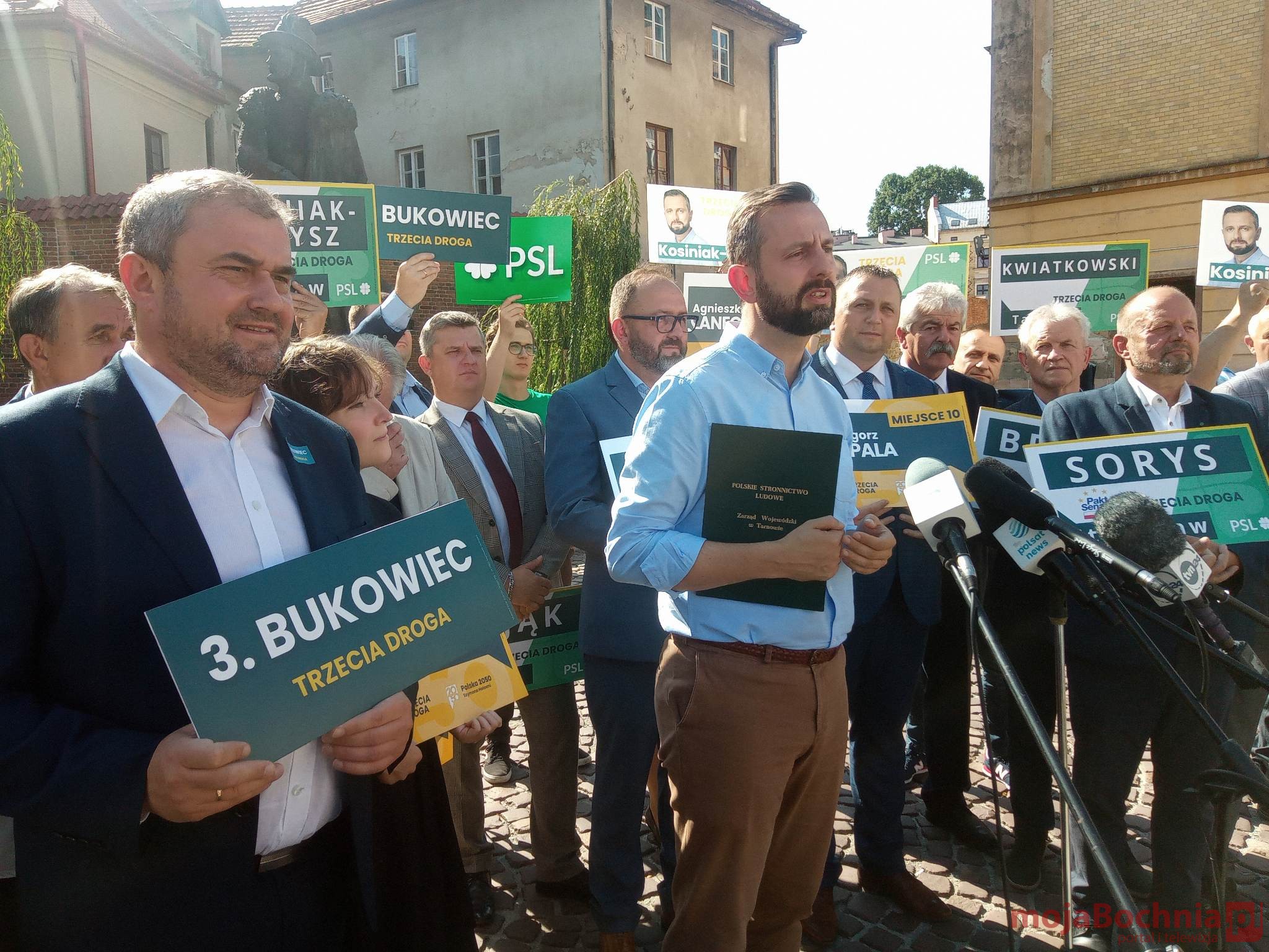 Władysław Kosiniak – Kamysz zwracał uwagę, że lista jest nie tylko bardzo mocna, ale także silnie reprezentowana przez samorządy, są na niej rolnicy, nauczyciele, przedstawiciele służby zdrowia. – Chcemy zakończyć wojnę polsko – polską, musimy wygra te wybory. Musimy by trzecią siłą w Sejmie. Mam nadziej, że nasz wynik wyborczy bezie w granicach 15 procent – mówił Władysław Kosiniak – Kamysz. prezes PSL poseł Władysław Kosiniak-Kamysz jest lokomotywą listy „Trzeciej Drogi” w okręgu tarnowskim. Władysław Kosiniak-Kamysz. Przy okazji poinformował, że wystosował list do Ursuli von der Leyen w kwestii problemów polskiego rolnictwa. Jego zdaniem embargo na żywność z Ukrainy powinno zostać przedłużone i objęło także, dla dobra polskich rolników, zahamowanie importu owoców miękkich. Na miejscu drugim jest Piotr Górnikiewicz, radny RM w Tarnowie, twórca potęgi kobiecej siatkówki w Tarnowie, społecznik. Natomiast na trzeciej lokacie jest Stanisław Bukowiec. – Ponad dwa lata temu wspólnie z innymi posłami odeszliśmy z koalicji z PiS-em. To był sprzeciw w sprawie m.in. wyborów kopertowych. „Piątki dla zwierząt” Kaczyńskiego i tzw. Polskiego Ładu. Byłem w tym czasie kuszony przez PiS różnymi politycznymi propozycjami i stanowiskami, ale mam swoje zasady i honor. Nie uznaję kłusownictwa politycznego – mówił Stanisław Bukowiec. Na głosy liczą także Paulina Zięba nauczycielka z Bochni – 8. miejsce, Bogusław Kamiński z Połomia Małego 11. miejsce. Na liście jest też Jan Pająk, wójt Drwini – miejsce 13. oraz Mirosław Chodur ze Starego Wiśnicza i Grzegorz Brach z Dębna.