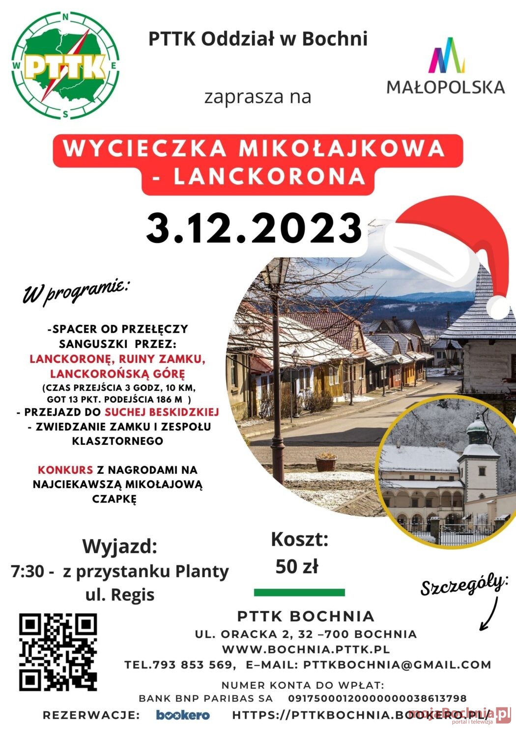 3.12. – Wycieczka mikołajowa – szukać „darczyńcę” będziemy przechadzając się po Lanckoronie i Lanckorońskim wzgórzu oraz po Suchej Beskidzkiej. Myślicie że uda się go spotkać? Ci, którzy na wycieczkę założą samodzielnie przygotowane czapki mikołajowe na pewno będą mieli szansę na prezenty https://bochnia.pttk.pl/…/wycieczka-mikolajowa-lanckorona