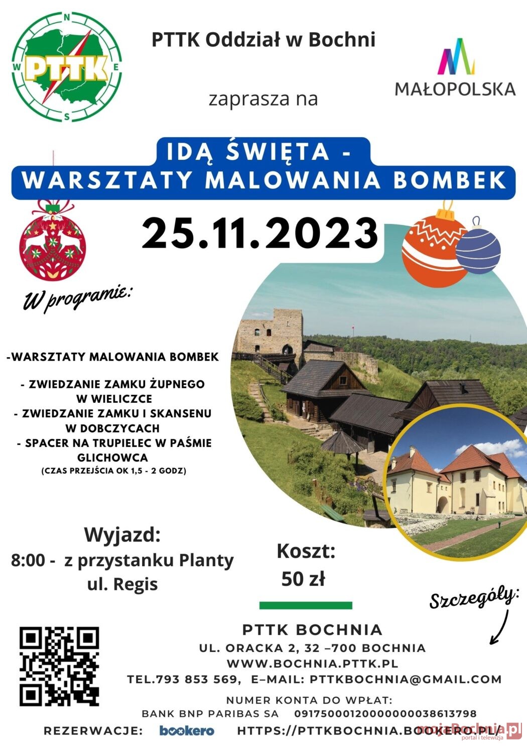 25.11. – a kto zamiast się bawić woli przygotowywać się do świąt – zapraszamy na warsztaty malowania bombek. Gotowe bombki zabieramy ze sobą a po warsztatach pójdziemy jeszcze pozwiedzać: Zamek Żupny w Wieliczce, Zamek i skansen w Dobczycach ▶️ https://bochnia.pttk.pl/event/warsztaty-malowania-bombek