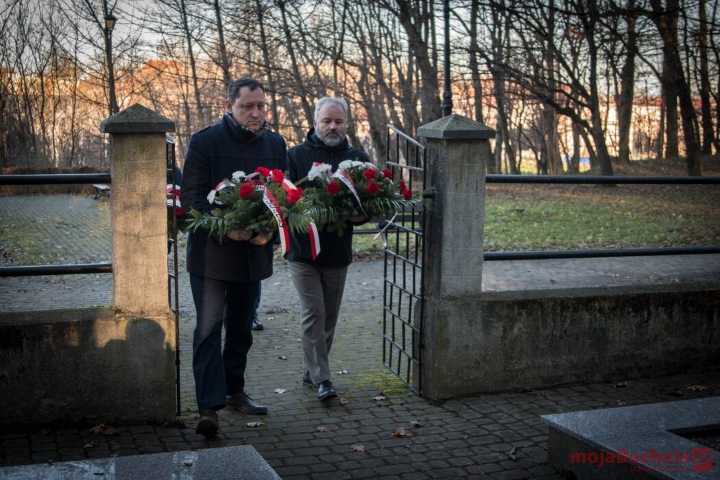 Kwiaty pod pomnikiem 52 ofiar zbrodni hitlerowskiej złożyli: wicestarosta bocheński Ryszard Drożdżak, zastępca burmistrza miasta Robert Cerazy oraz przedstawiciele bocheńskiego oddziału Światowego Związku Żołnierzy Armii Krajowej Jacek Kozioł.