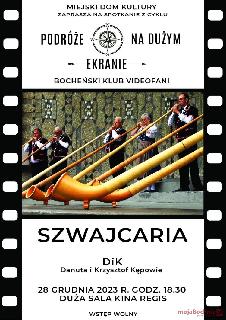 Ten cykl prezentacji amatorskich filmów wykonanych przez bochnian skupionych w Bocheńskim Klubie „Videofani” cieszy się stale rosnącą popularnością. Tym razem swoje filmy pokaże znany widowni tego cyklu duet producencki Danuta i Krzysztof Kępowie, którzy zabiorą zebranych w podróż do Szwajcarii.