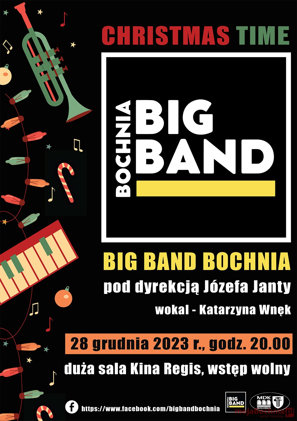 W najbliższy czwartek 28 grudnia 2023 r. o godz. 20 w dużej sali kina Regis rozpocznie się koncert „Christmas Time” w wykonaniu Big Band Bochnia. Po raz drugi zespół zaprezentuje się w świątecznym repertuarze, z pewnością propozycja zespołu będzie wydarzeniem muzycznym na wysokim poziomie.