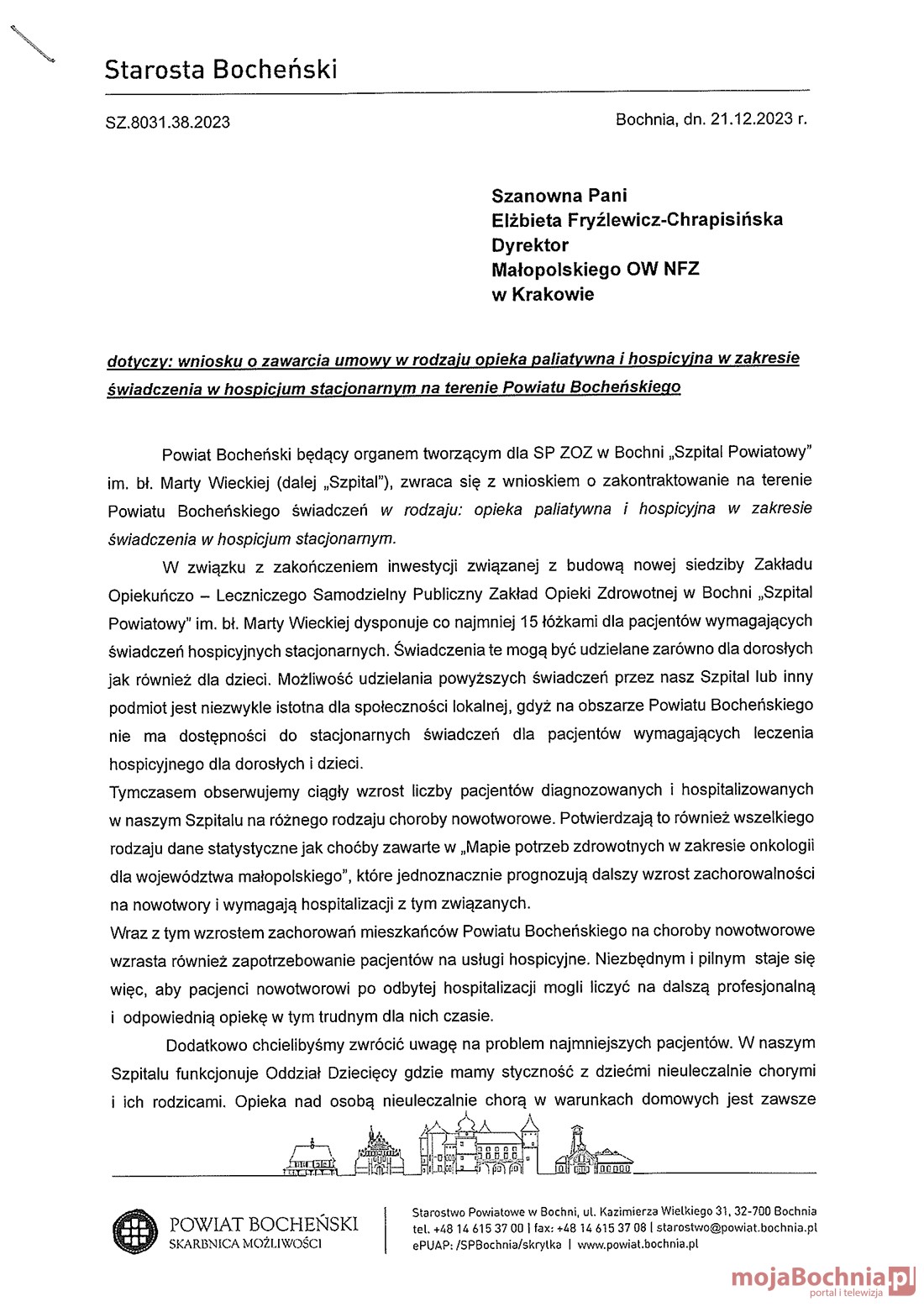 Starosta Bocheński, Adam Korta zwrócił się z oficjalnym pismem do Dyrektor Małopolskiego Oddziału Wojewódzkiego NFZ, Elżbiety Fryźlewicz-Chrapisińskiej, zabiegając o pilne zakontraktowanie usług hospicjum stacjonarnego. To szczególnie istotne, gdyż 15 łóżek przeznaczonych dla pacjentów paliatywnych wciąż czeka na uruchomienie.