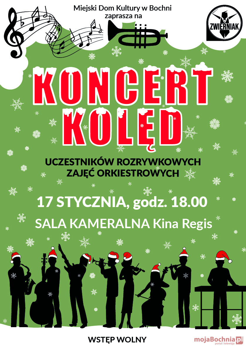W środę 17 stycznia 2024 roku o godz. 18 w sali kameralnej Miejskiego Domu Kultury wystąpią dzieci i młodzież z Rozrywkowej Sekcji Orkiestrowej. Koncert kolęd będzie kolejnym wydarzeniem podczas którego uczestnicy zaprezentują umiejętności muzyczne i wokalne nabyte podczas zajęć prowadzonych przez Wojciecha Zwierniaka.