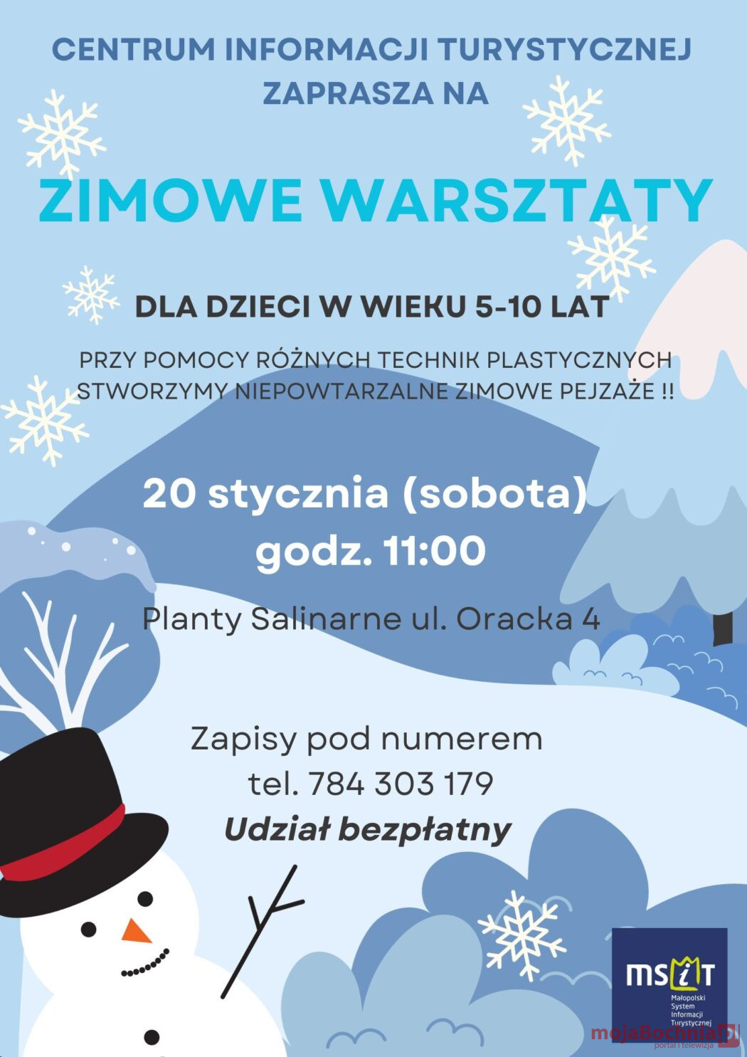 W najbliższą sobotę 20 stycznia 2024 r. o godz. 11:00 w Centrum Informacji Turystycznej odbędą się warsztaty artystyczne dla dzieci w wieku 5-10 lat. Na zajęciach uczestnicy stworzą, przy pomocy różnych technik plastycznych, niepowtarzalne zimowe krajobrazy.