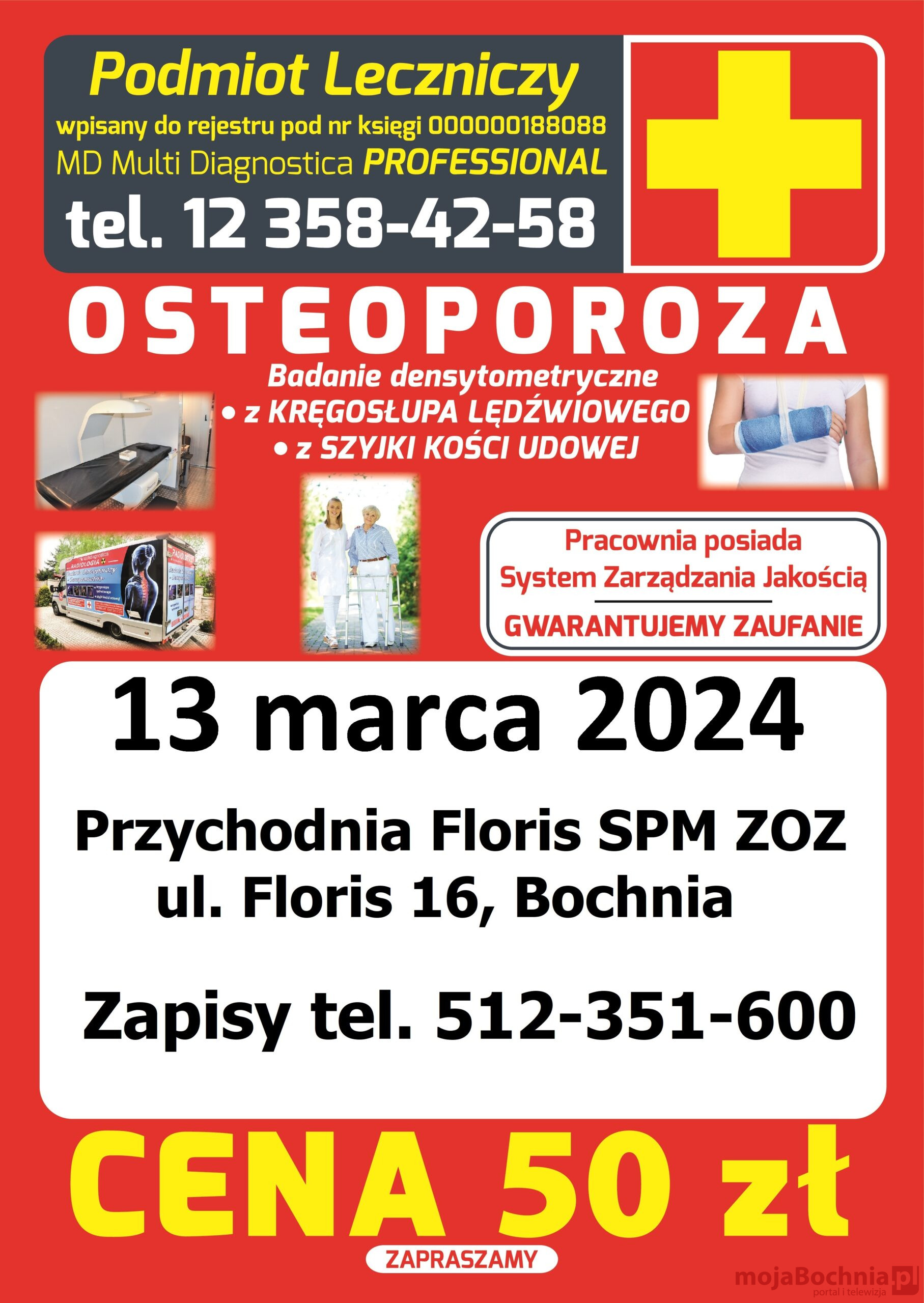 We wtorek 13 marca odbędą się w Bochni badania diagnostyczne w kierunku osteoporozy. Wykonane zostaną w mobilnej pracowni densytometrycznej, która zostanie zlokalizowana przy Przychodnia Floris SPM ZOZ ul. Floris 16. Diagnostykę przeprowadzi personel MD Multi Diagnostica z Krakowa. Cena jednego badania wynosi 50 złotych.