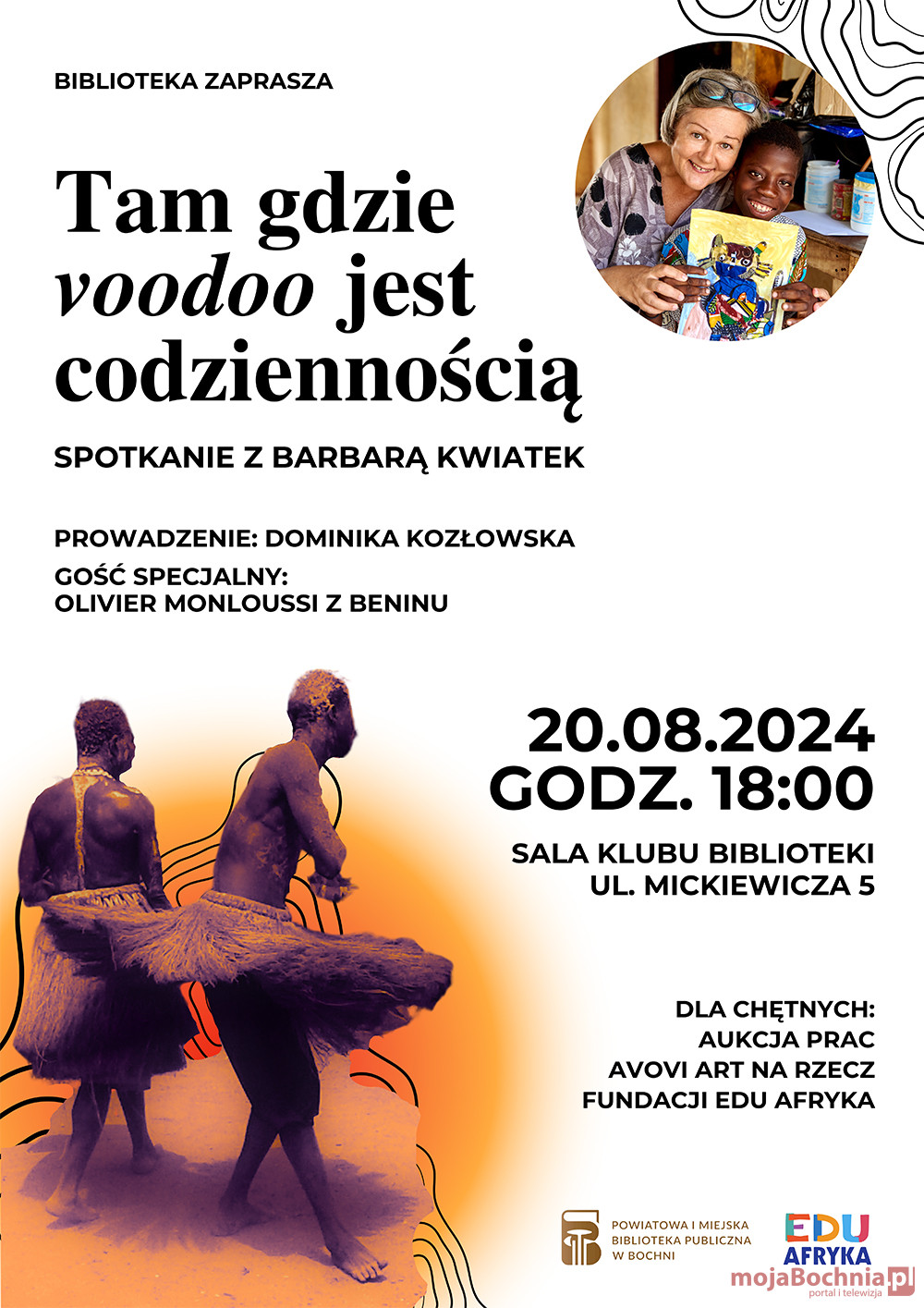Benin w Afryce Zachodniej – to tam gdzie voodoo jest codziennością. Czy straszną? Czy mroczną? Powiatowa i Miejska Biblioteka Publiczna w Bochni zaprasza na spotkanie z Barbarą Kwiatek, dla której, od jedenastu lat, Benin jest domem. Na co dzień prowadzi organizację wspierającą edukację dzieci i młodzieży EDU Afryka. Spotkanie, które poprowadzi Dominika Kozłowska, odbędzie się 20 sierpnia 2024 r. o godz. 18.00 w sali klubu Biblioteki, ul. Mickiewicza 5.
