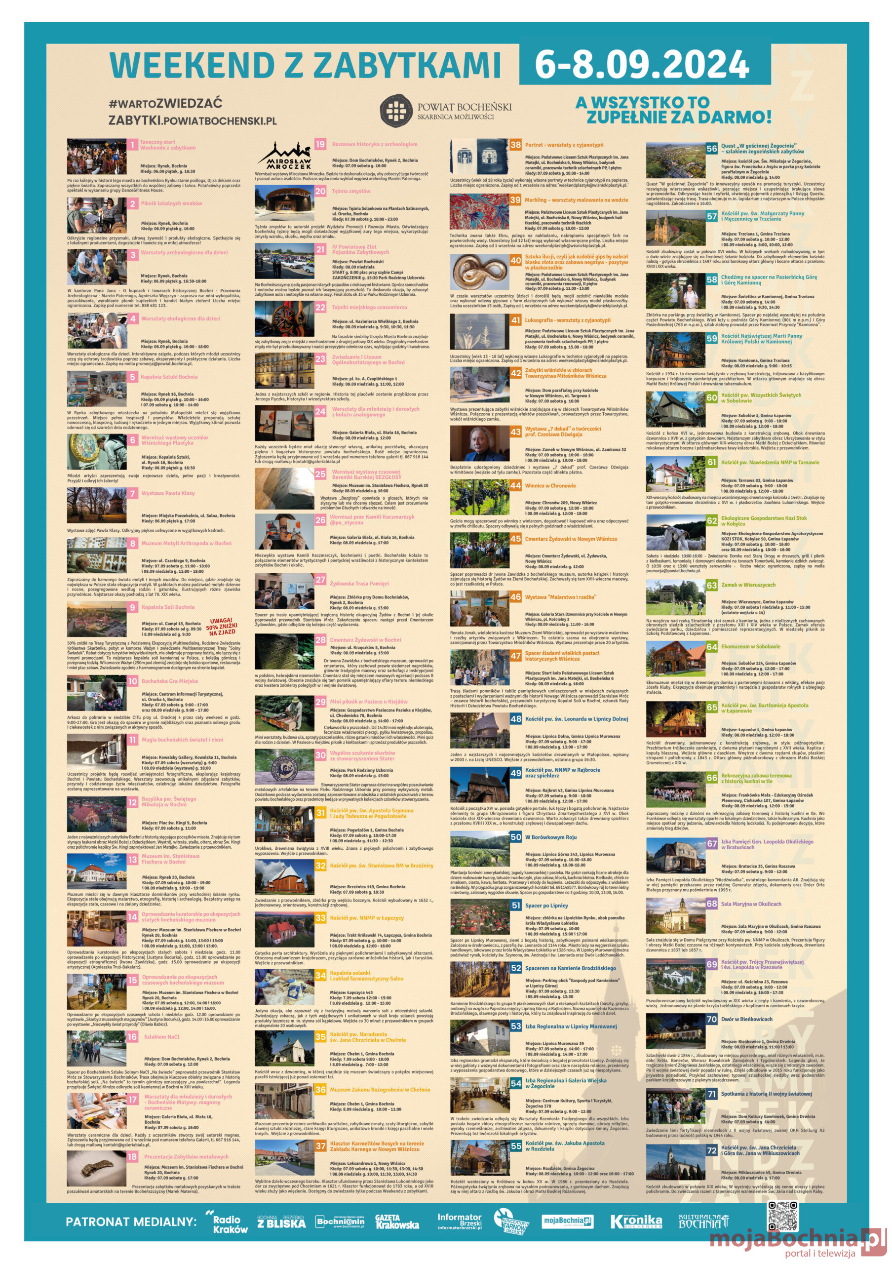 Tegoroczny weekend oferuje nie tylko wiele zabytków i wydarzeń, ale także szereg nowych atrakcji dzięki naszym dotychczasowym oraz nowym partnerom. To wyjątkowa okazja, aby podążając śladami przeszłości odkrywać takie miejsca, jak najstarsza szkoła w Bochni czy kościółek w Brzeźnicy.Warto odwiedzić też ekologiczne gospodarstwo Kozi Stok w Kobylcu, gdzie odbędą się warsztaty serowarskie. Zachęcam, by zaplanować cały weekend na poznawanie naszego pięknego powiatu — podkreśla starosta Adam Korta