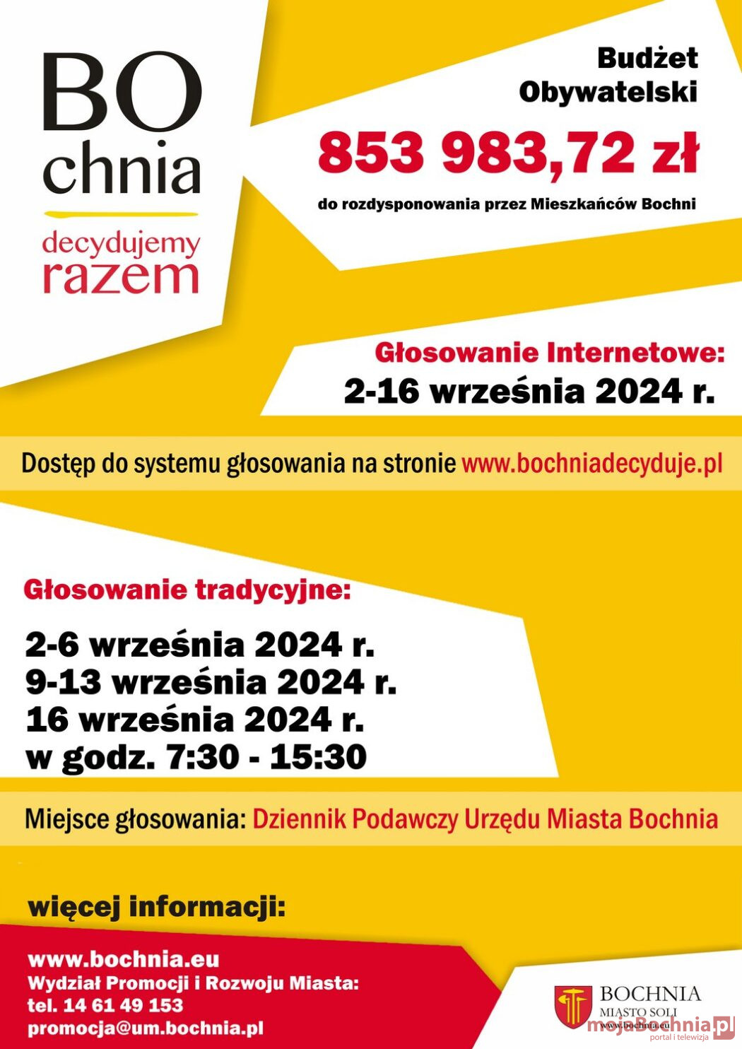 Swój głos można również oddać w sposób tradycyjny od poniedziałku (9 września) do piątku (13 września) oraz w poniedziałek 16 września w godz. 7:30-15:30 na Dzienniku Podawczym Urzędu Miasta Bochnia.