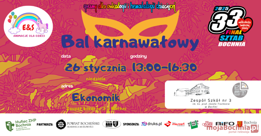 W ramach 33. Finału WOŚP czeka nas niesamowita zabawa pełna kolorów, śmiechu i tańca! Serdecznie zapraszamy Małych Gości, w wieku 2-7 lat, na niezwykły Bal Karnawałowy, gdzie czekać będą magiczne przebrania, konkursy, zabawy i mnóstwo radosnej muzyki!