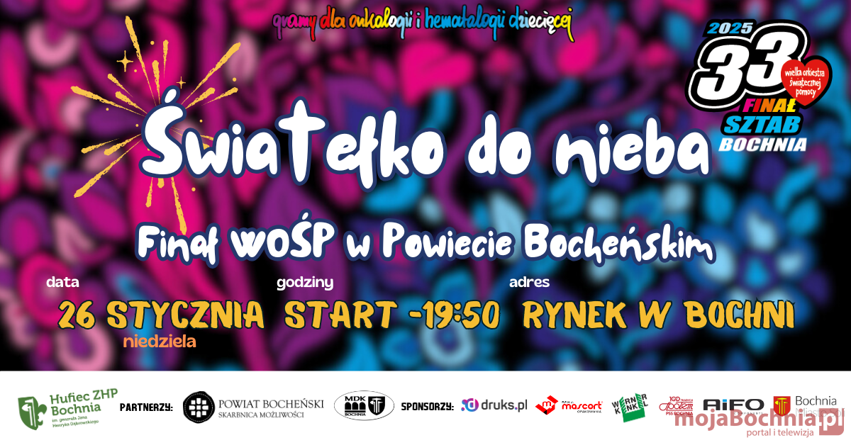 Zapraszamy na wyjątkowe Światełko do Nieba, które zwieńczy 33. Finał WOŚP w Powiecie Bocheńskim! To symboliczne zakończenie weekendu pełnego dobra, wspólnej energii i niesamowitych emocji.