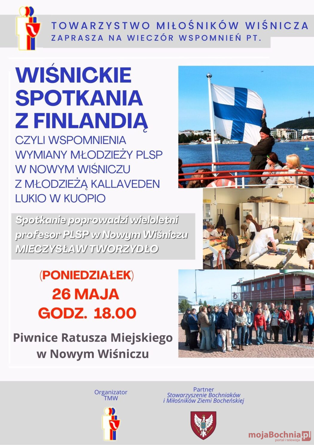 W poniedziałek w piwnicach Ratusza Miejskiego odbędzie się kolejne wydarzenie organizowane przez Towarzystwo Przyjaciół Wiśnicza. Tym razem będzie to „Wiśnickie spotkania z Finlandią”, czyli wspomnienia wymiany młodzieży PLSP w Nowym Wiśniczu z młodzieżą Kallaveden lukio w Kuopio, które poprowadzi wieloletni profesor PLSP w Nowym Wiśniczu – Mieczysław Tworzydło.