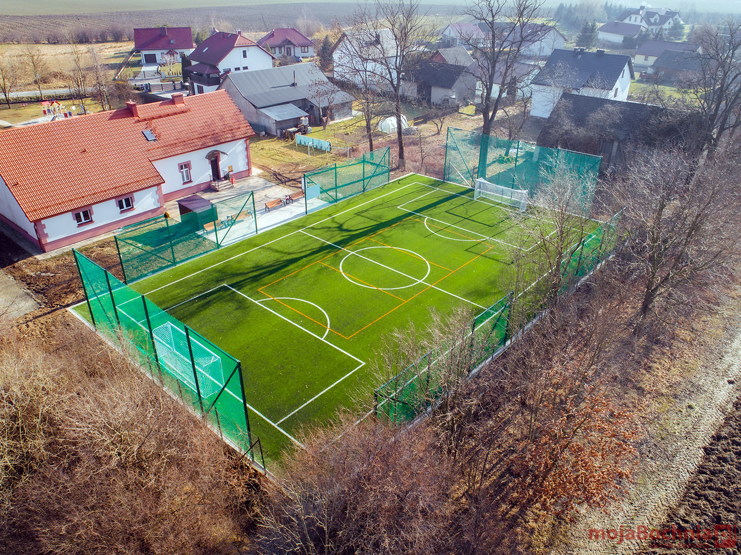 Boisko wielofunkcyjne o nawierzchni ze sztucznej trawy powstało na istniejącym boisku trawiastym w miejscowości Ostrów Szlachecki.