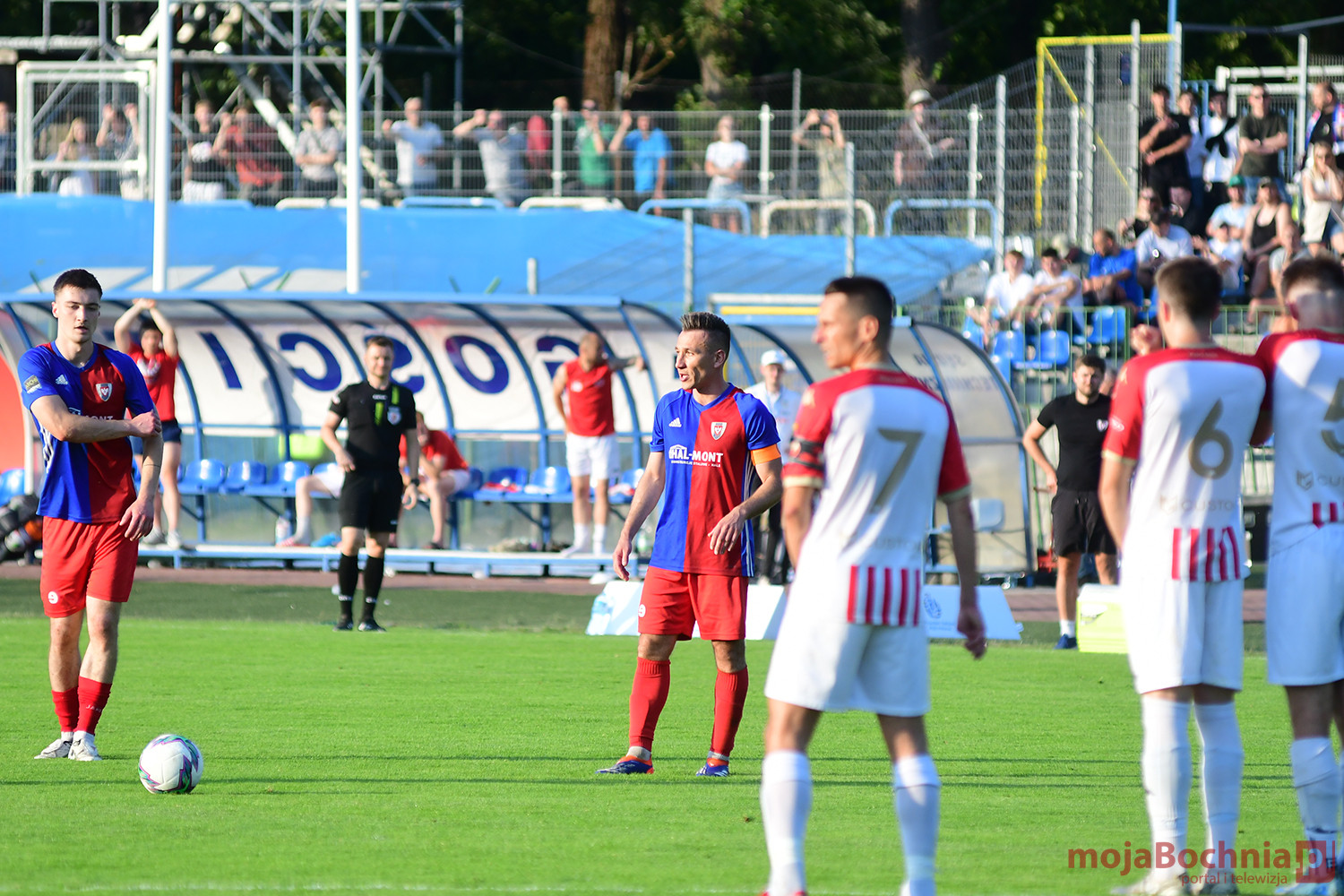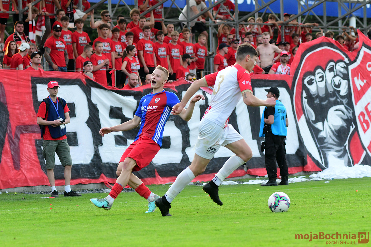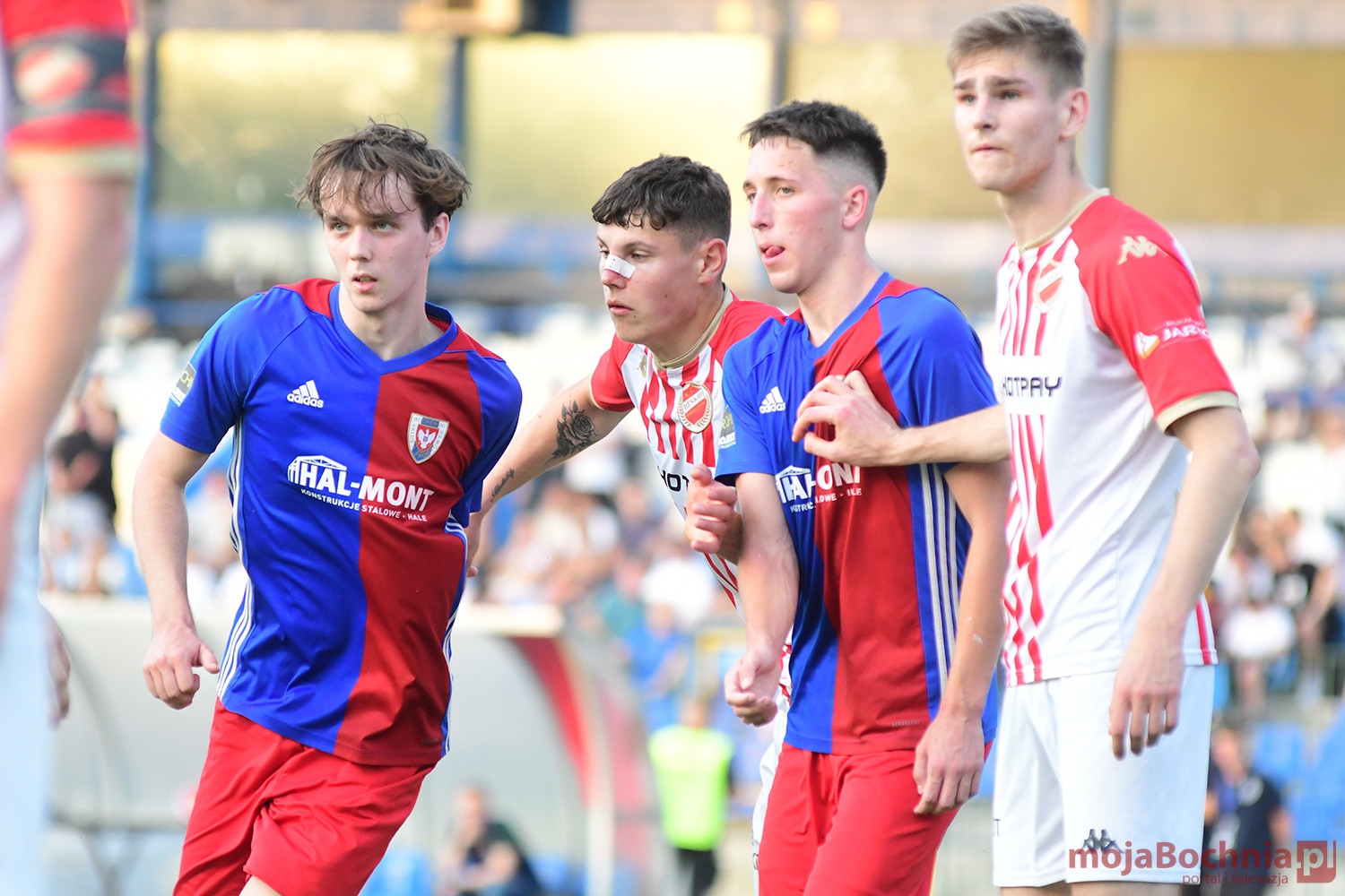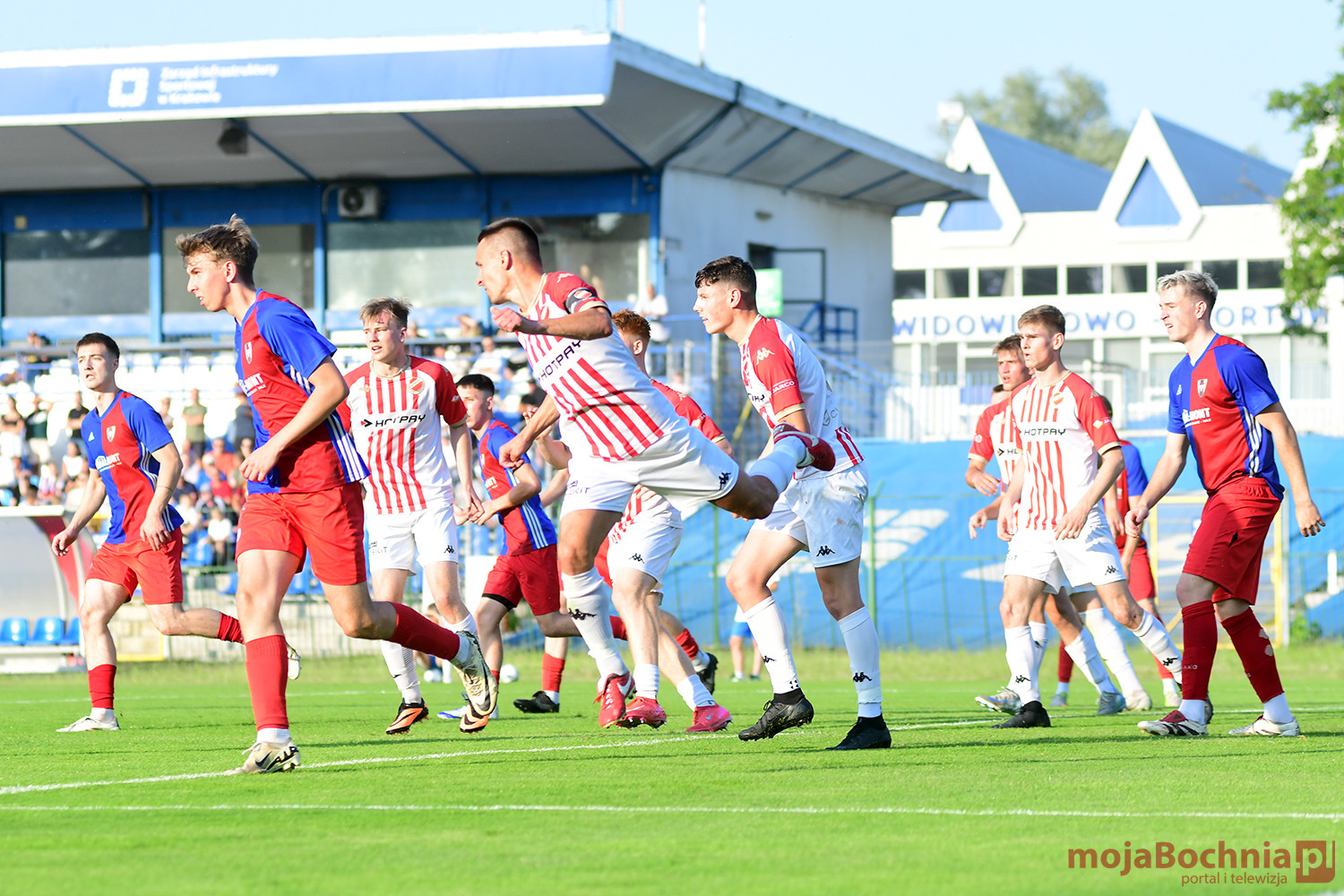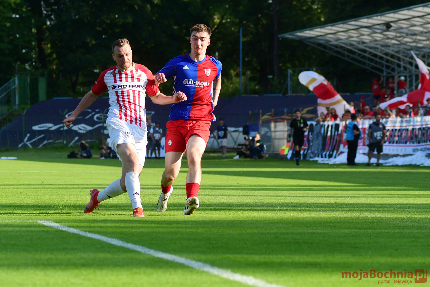 Rozgrywany na obiekcie Hutnika Kraków jeden z najważniejszych meczów w najnowszej historii BKS-u rozpoczął się idealnie dla podopiecznych trenera Damiana Rębisza, bo błyskawicznie wywalczyli rzut karny po faulu na Mateuszu Grzybowskim. Szansę wykorzystał Hubert Skocz. Niestety przeciwnicy dość szybko podnieśli się po nieudanym początku. Po ataku prawym skrzydłem piłka trafiła do Oliwiera Pilcha, a ten wykorzystał wolną przestrzeń i doprowadził do remisu strzałem przy dalszym słupku. Bochnianie mogli szybko odpowiedzieć, ale Skocz trafił z dystansu jedynie w poprzeczkę. Do końca pierwszej połowy wynik nie uległ już zmianie, bo obie drużyny zaczęły grać ostrożniej.