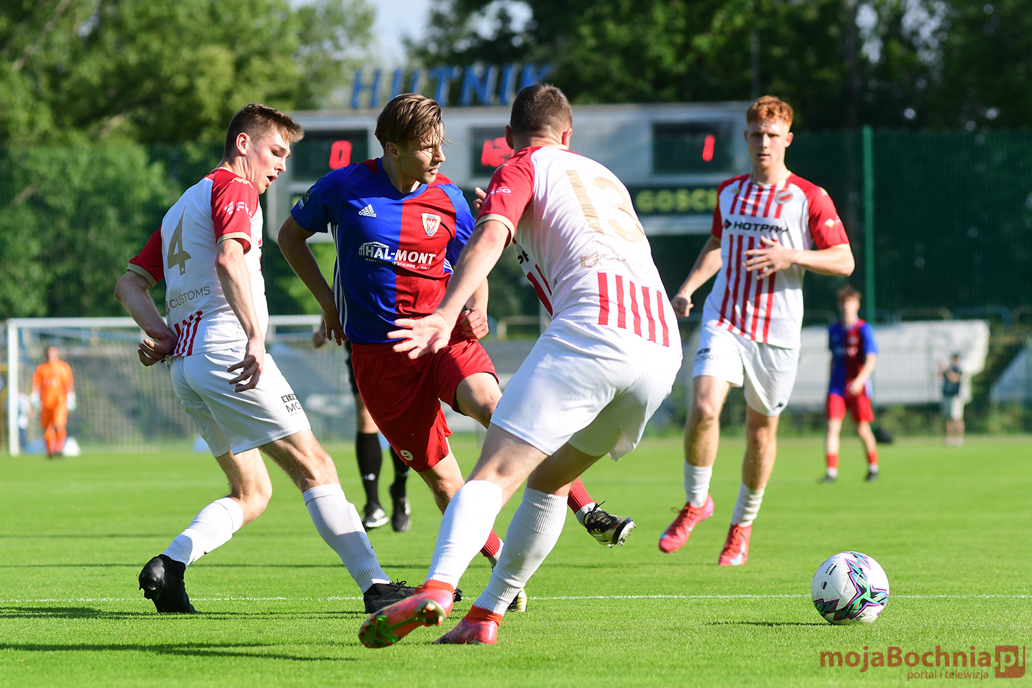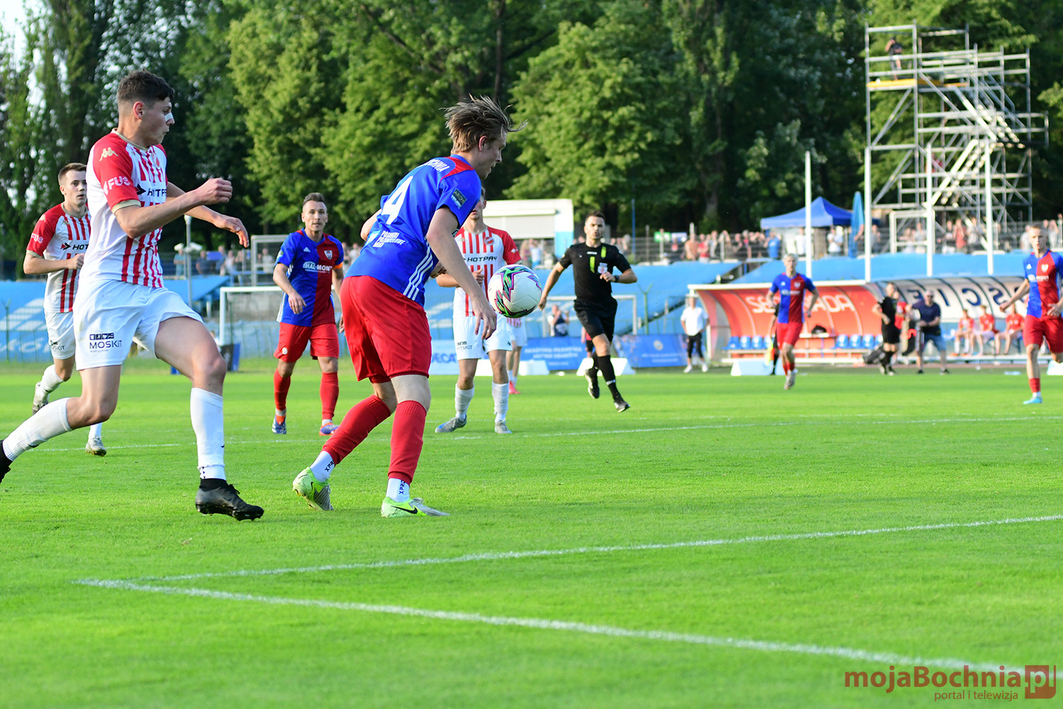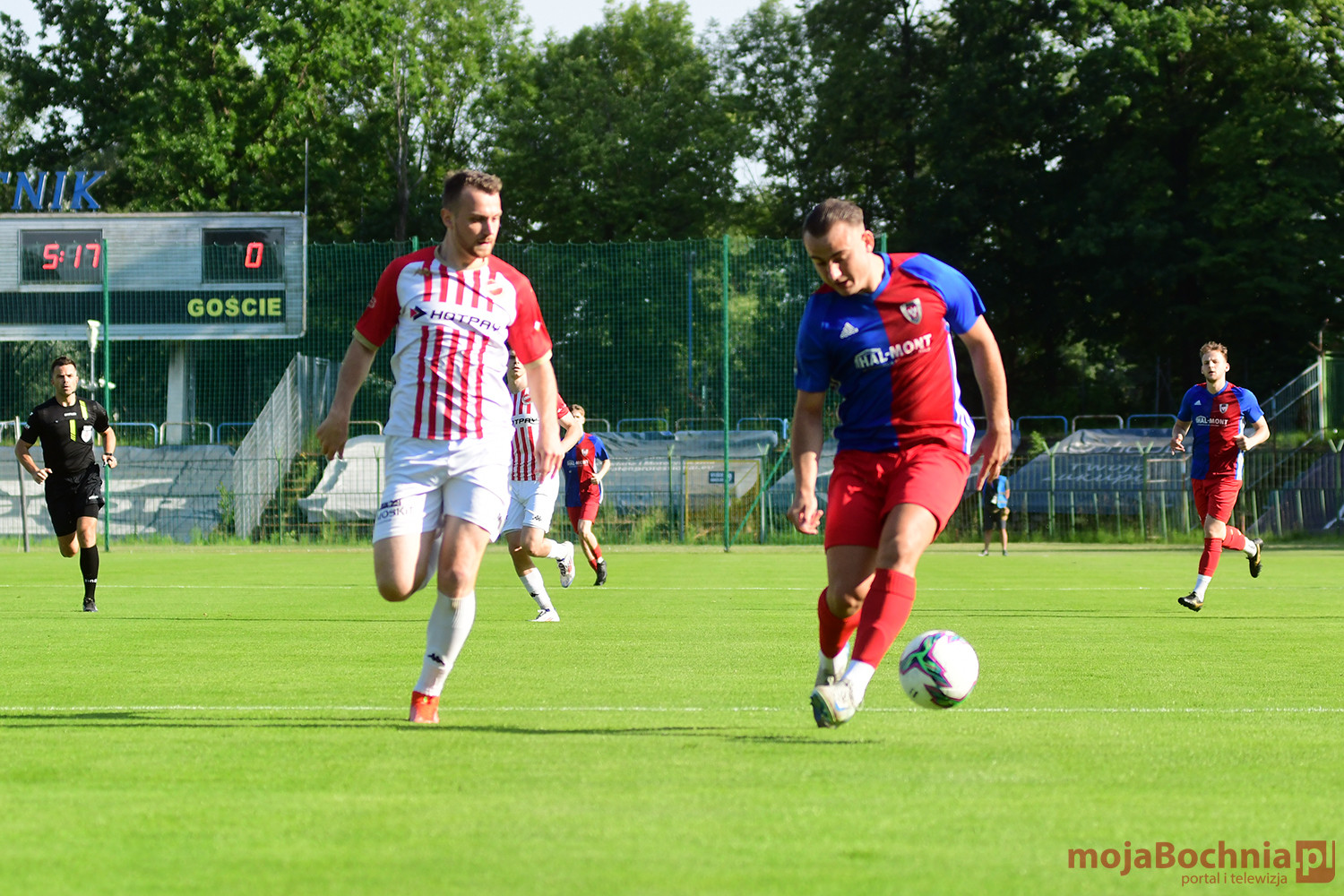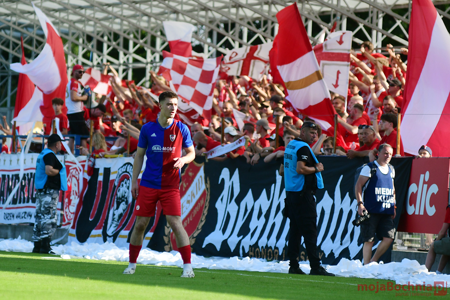 Rozgrywany na obiekcie Hutnika Kraków jeden z najważniejszych meczów w najnowszej historii BKS-u rozpoczął się idealnie dla podopiecznych trenera Damiana Rębisza, bo błyskawicznie wywalczyli rzut karny po faulu na Mateuszu Grzybowskim. Szansę wykorzystał Hubert Skocz. Niestety przeciwnicy dość szybko podnieśli się po nieudanym początku. Po ataku prawym skrzydłem piłka trafiła do Oliwiera Pilcha, a ten wykorzystał wolną przestrzeń i doprowadził do remisu strzałem przy dalszym słupku. Bochnianie mogli szybko odpowiedzieć, ale Skocz trafił z dystansu jedynie w poprzeczkę. Do końca pierwszej połowy wynik nie uległ już zmianie, bo obie drużyny zaczęły grać ostrożniej.
