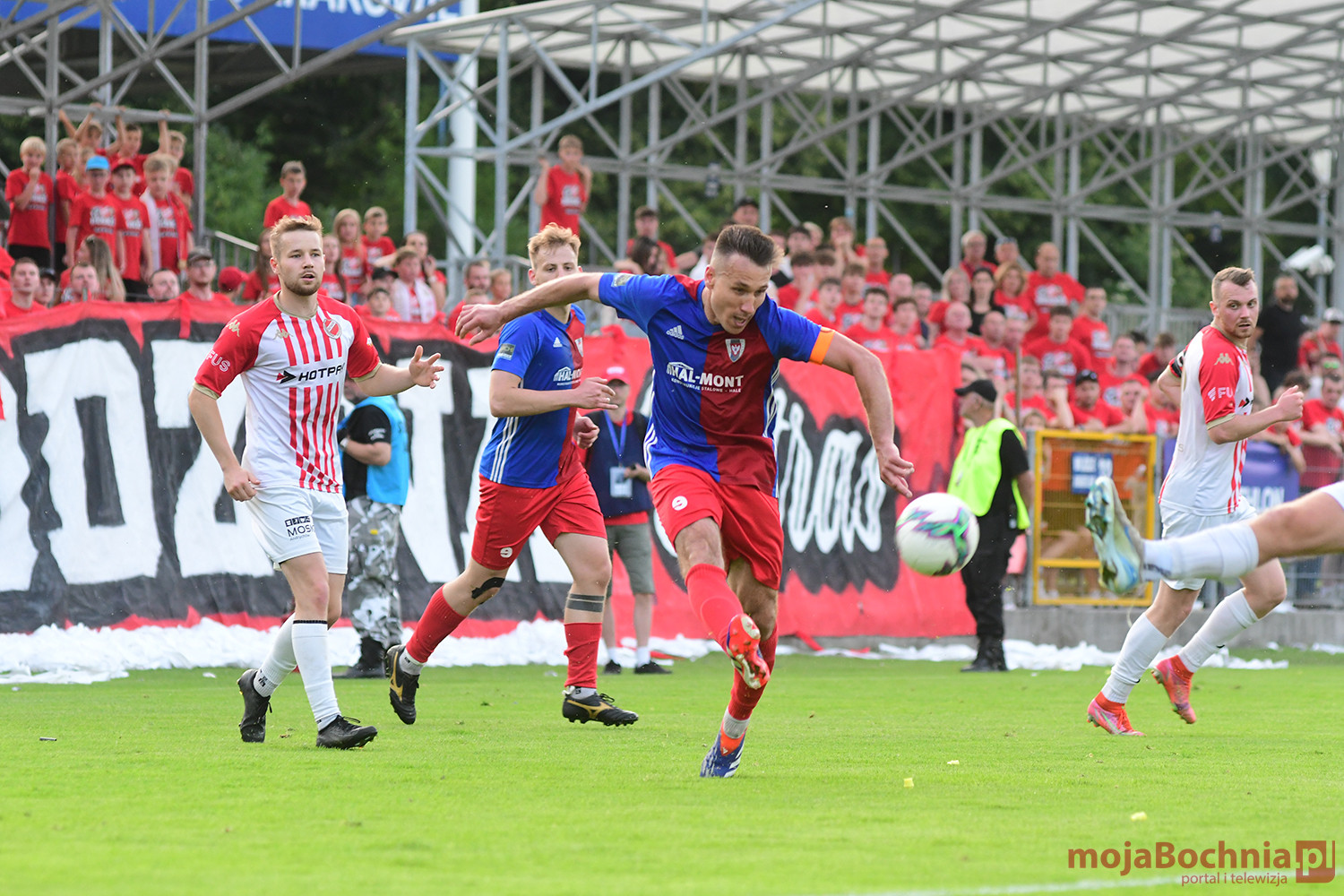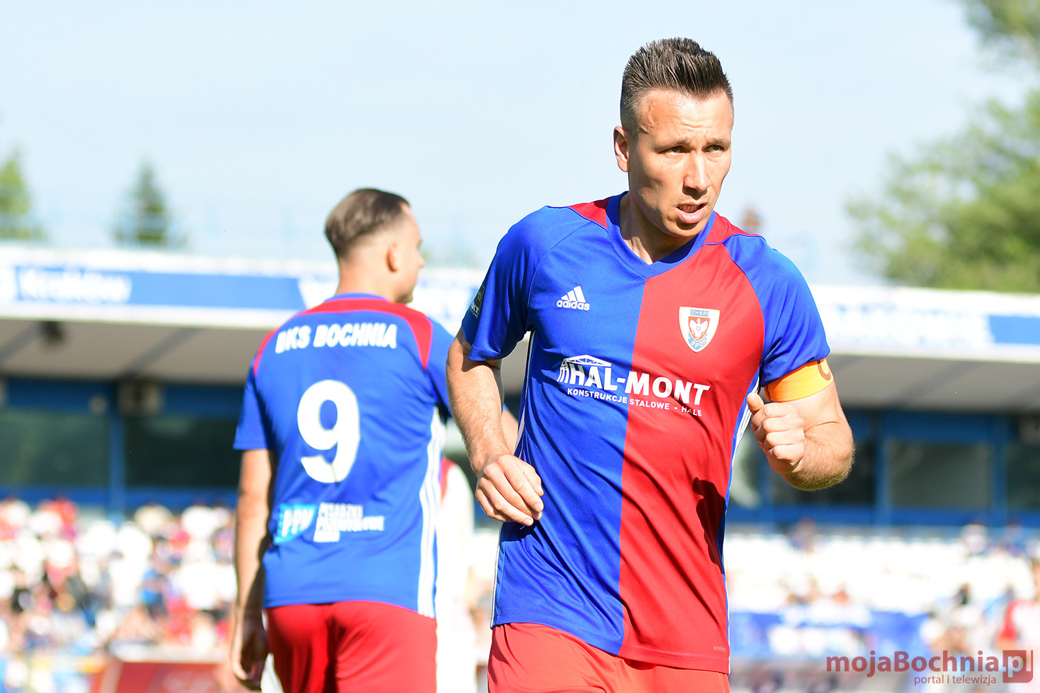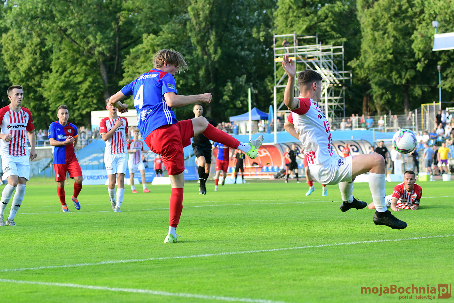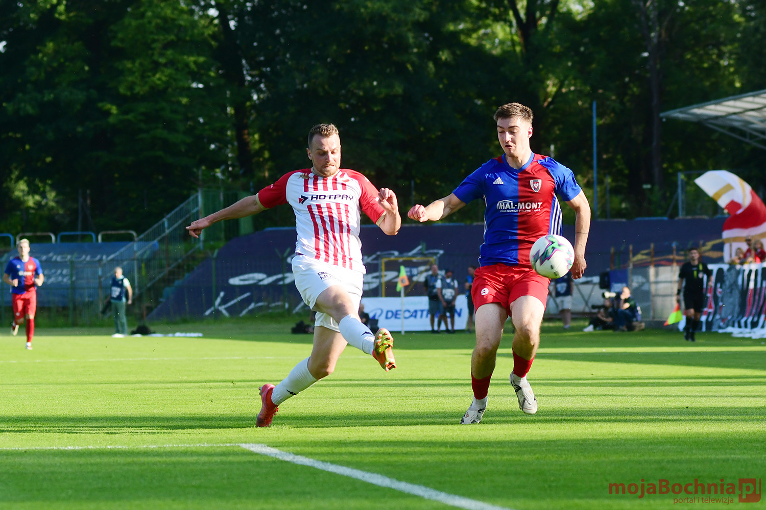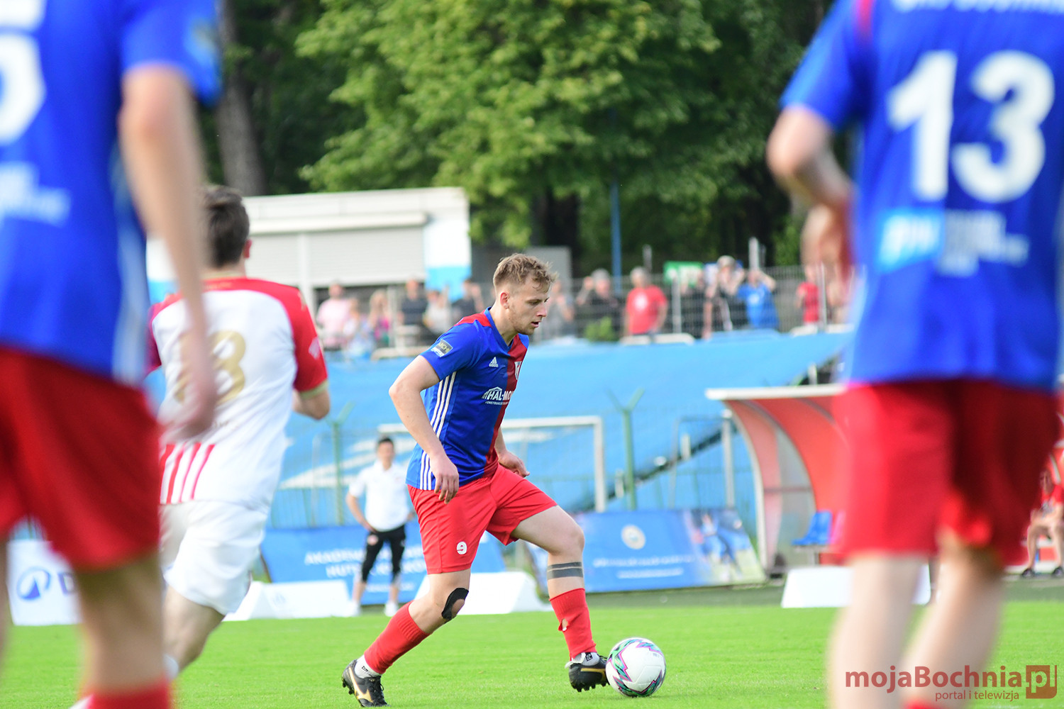 Rozgrywany na obiekcie Hutnika Kraków jeden z najważniejszych meczów w najnowszej historii BKS-u rozpoczął się idealnie dla podopiecznych trenera Damiana Rębisza, bo błyskawicznie wywalczyli rzut karny po faulu na Mateuszu Grzybowskim. Szansę wykorzystał Hubert Skocz. Niestety przeciwnicy dość szybko podnieśli się po nieudanym początku. Po ataku prawym skrzydłem piłka trafiła do Oliwiera Pilcha, a ten wykorzystał wolną przestrzeń i doprowadził do remisu strzałem przy dalszym słupku. Bochnianie mogli szybko odpowiedzieć, ale Skocz trafił z dystansu jedynie w poprzeczkę. Do końca pierwszej połowy wynik nie uległ już zmianie, bo obie drużyny zaczęły grać ostrożniej.