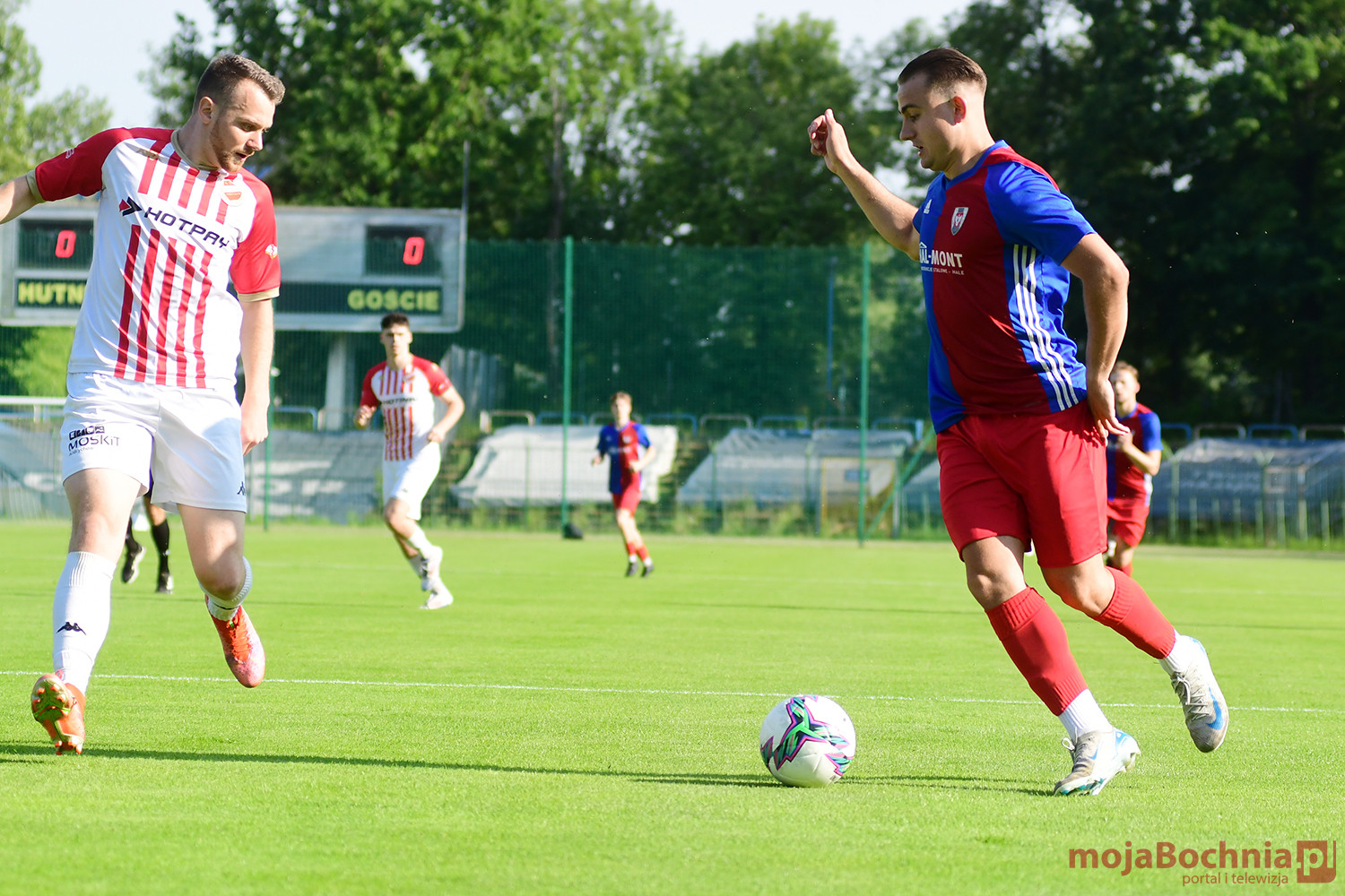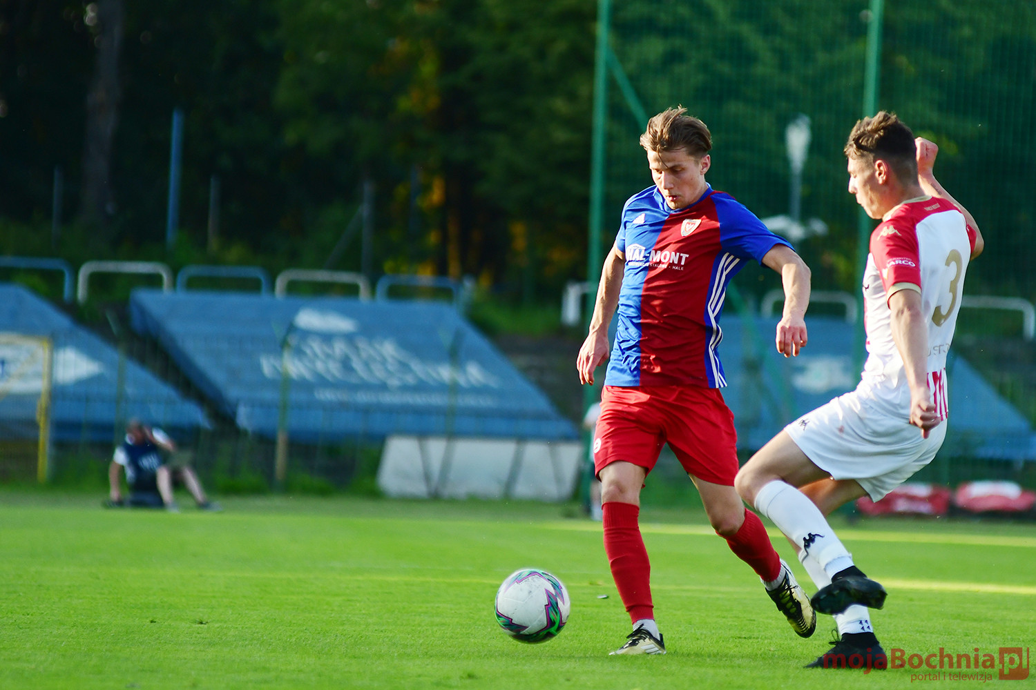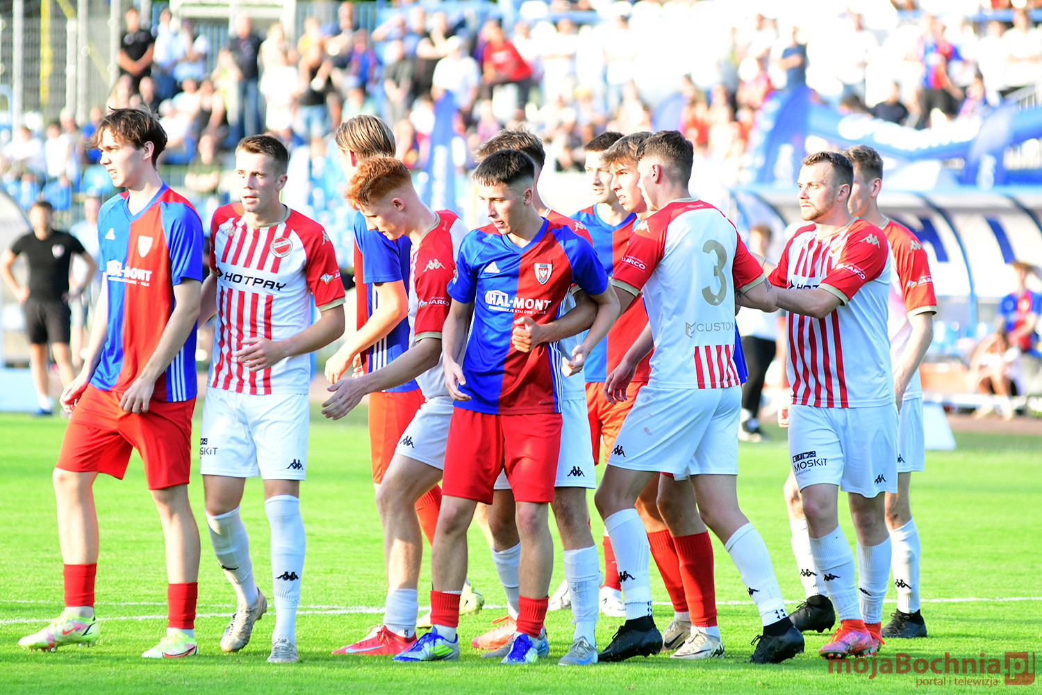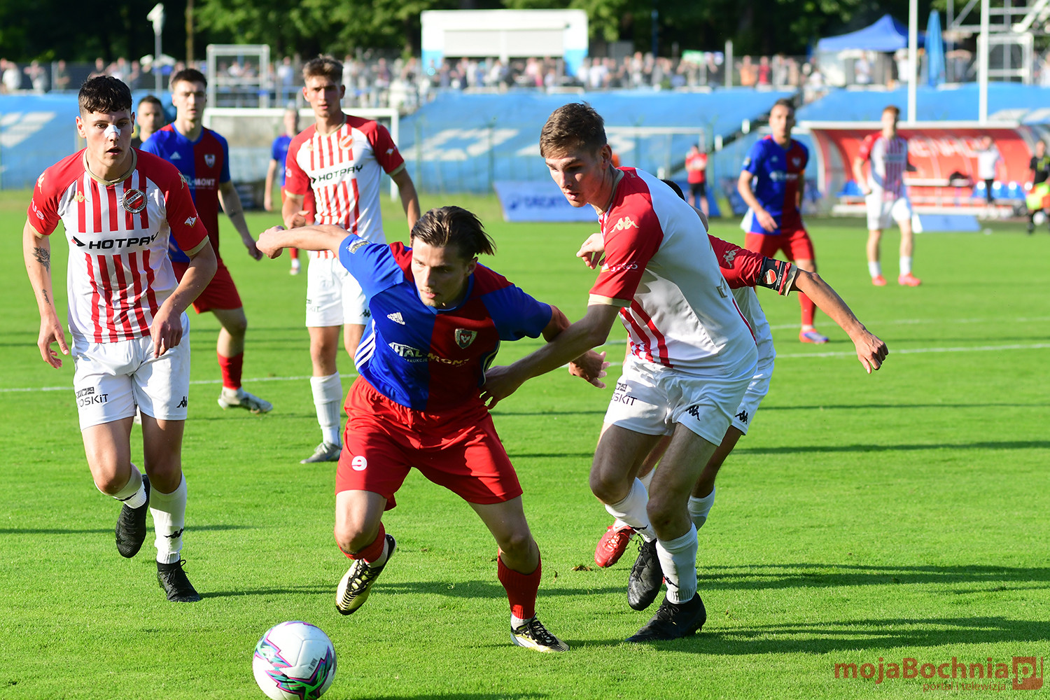 Rozgrywany na obiekcie Hutnika Kraków jeden z najważniejszych meczów w najnowszej historii BKS-u rozpoczął się idealnie dla podopiecznych trenera Damiana Rębisza, bo błyskawicznie wywalczyli rzut karny po faulu na Mateuszu Grzybowskim. Szansę wykorzystał Hubert Skocz. Niestety przeciwnicy dość szybko podnieśli się po nieudanym początku. Po ataku prawym skrzydłem piłka trafiła do Oliwiera Pilcha, a ten wykorzystał wolną przestrzeń i doprowadził do remisu strzałem przy dalszym słupku. Bochnianie mogli szybko odpowiedzieć, ale Skocz trafił z dystansu jedynie w poprzeczkę. Do końca pierwszej połowy wynik nie uległ już zmianie, bo obie drużyny zaczęły grać ostrożniej.