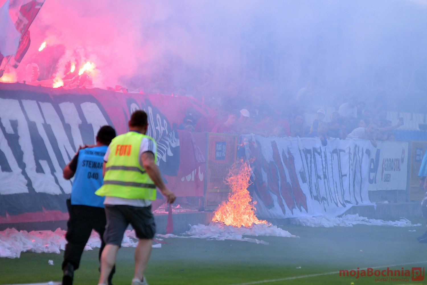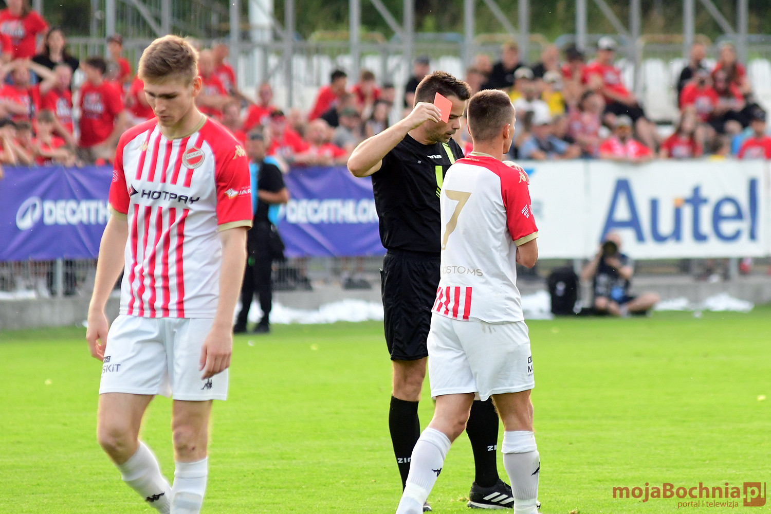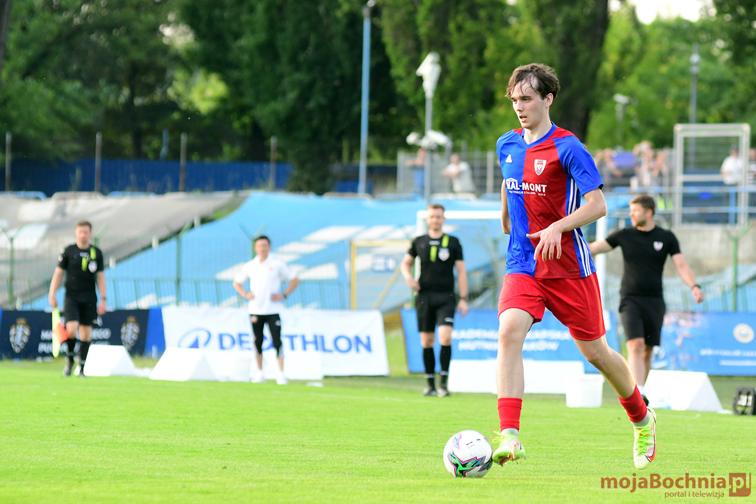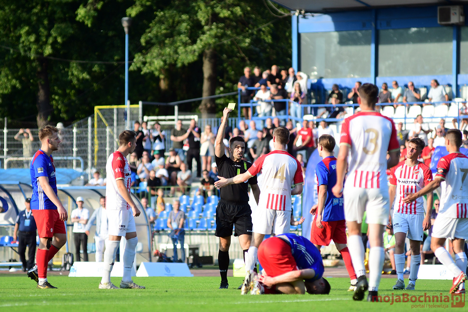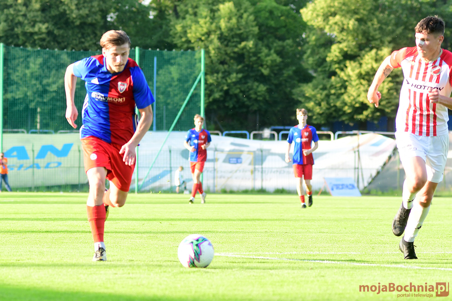 Rozgrywany na obiekcie Hutnika Kraków jeden z najważniejszych meczów w najnowszej historii BKS-u rozpoczął się idealnie dla podopiecznych trenera Damiana Rębisza, bo błyskawicznie wywalczyli rzut karny po faulu na Mateuszu Grzybowskim. Szansę wykorzystał Hubert Skocz. Niestety przeciwnicy dość szybko podnieśli się po nieudanym początku. Po ataku prawym skrzydłem piłka trafiła do Oliwiera Pilcha, a ten wykorzystał wolną przestrzeń i doprowadził do remisu strzałem przy dalszym słupku. Bochnianie mogli szybko odpowiedzieć, ale Skocz trafił z dystansu jedynie w poprzeczkę. Do końca pierwszej połowy wynik nie uległ już zmianie, bo obie drużyny zaczęły grać ostrożniej.