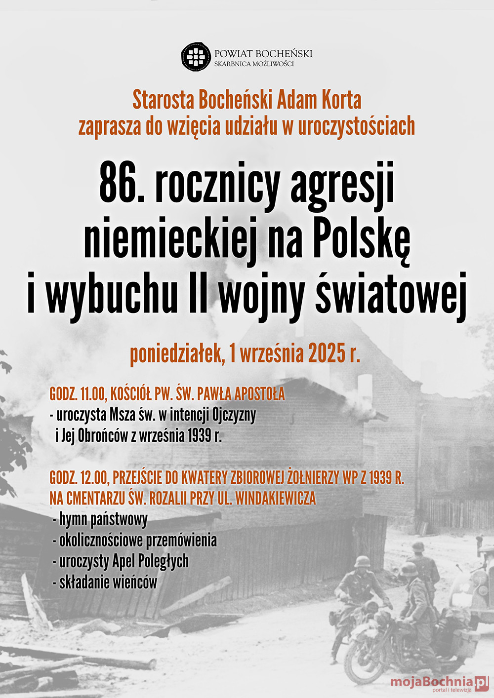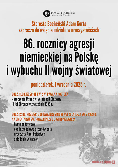 1 września mija 86 lat od agresji Niemiec na Polskę i wybuchu II Wojny Światowej. To dzień, w którym wspominamy bohaterstwo i ofiarę żołnierzy oraz cywilów broniących Ojczyzny we wrześniu 1939 roku. Adam Korta Starosta Bocheński zaprasza mieszkańców do wspólnego uczczenia tej rocznicy podczas uroczystości w Bochni.