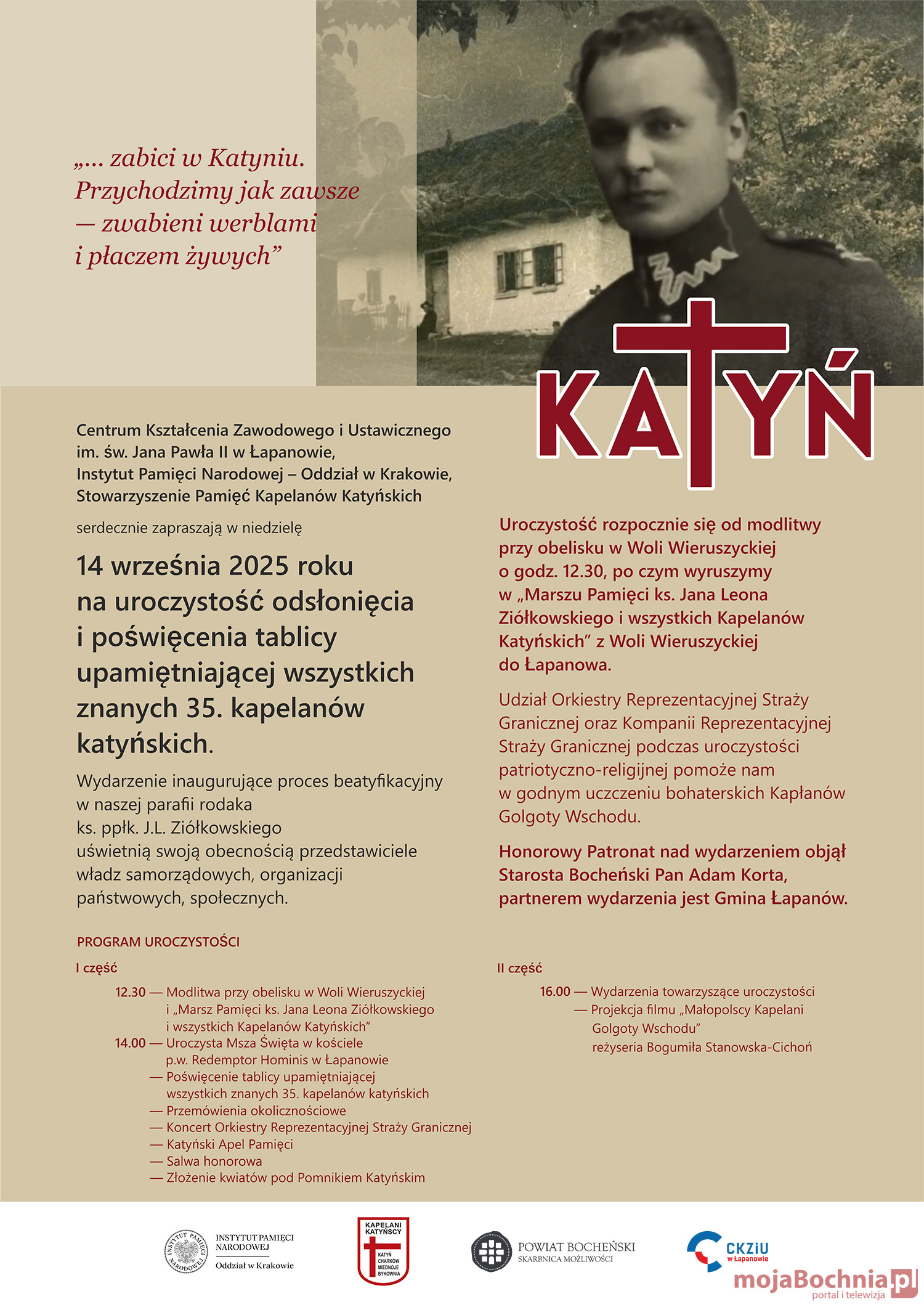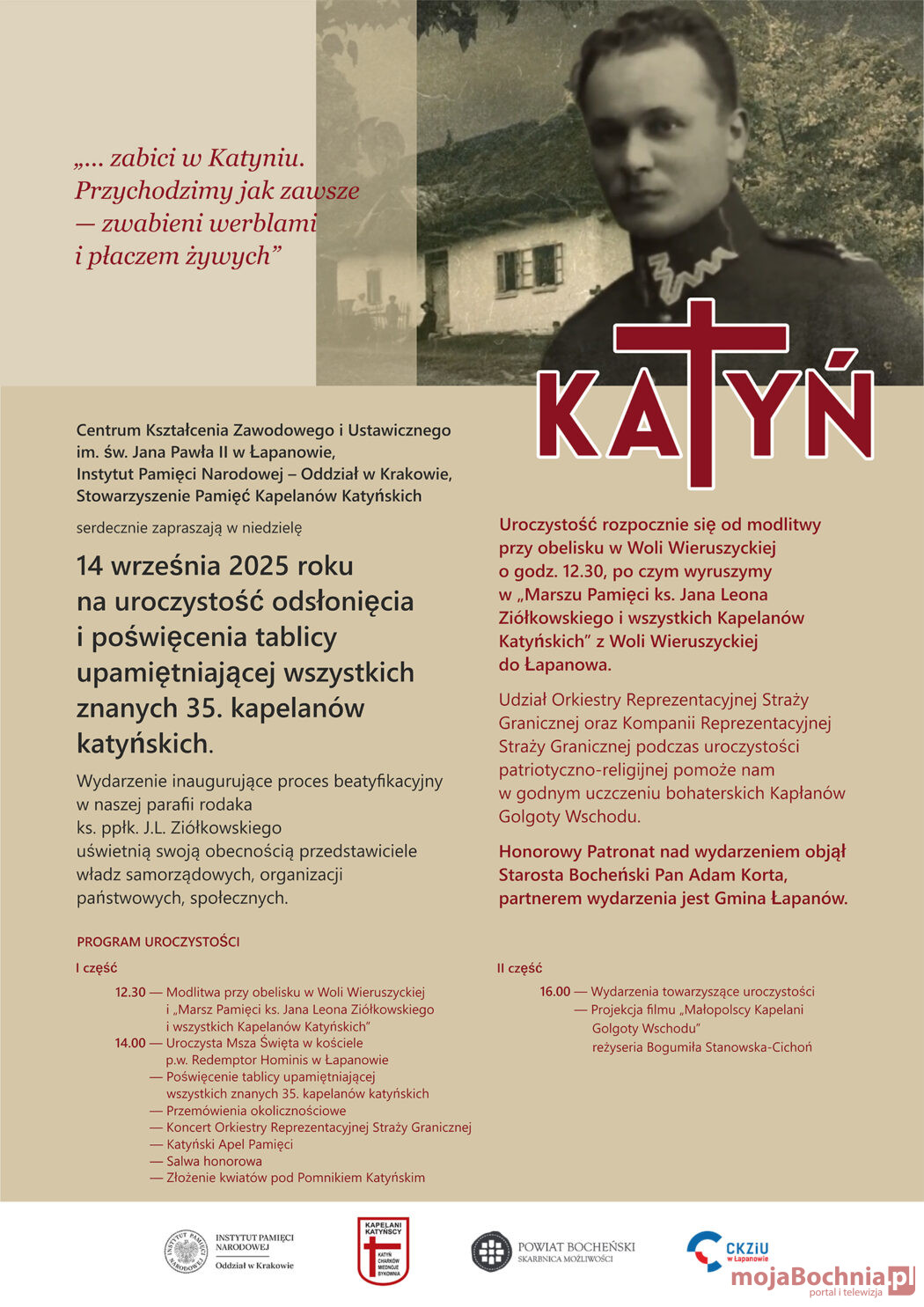 Centrum Kształcenia Zawodowego i Ustawicznego im. św. Jana Pawła II w Łapanowie, Instytut Pamięci Narodowej – Oddział w Krakowie, Stowarzyszenie Pamięć Kapelanów Katyńskich serdecznie zapraszają w niedzielę 14 września 2025 roku na uroczystość odsłonięcia i poświęcenia tablicy upamiętniającej wszystkich znanych 35. kapelanów katyńskich.