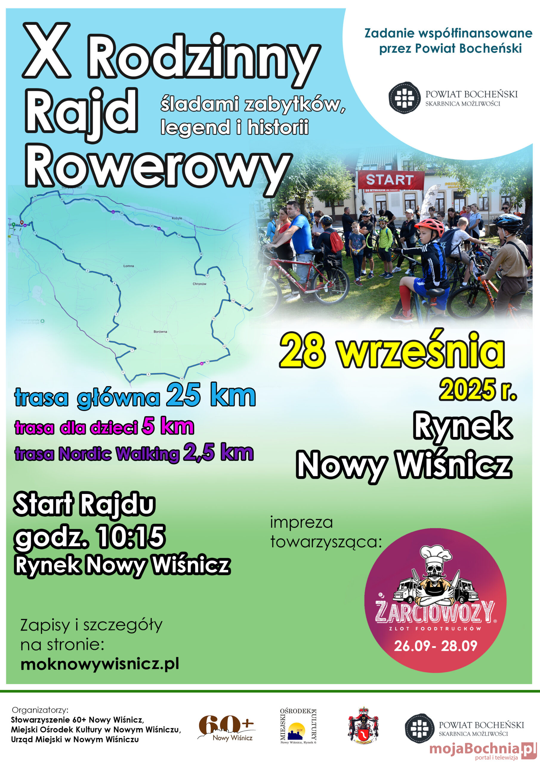 Stowarzyszenie 60+ Nowy Wiśnicz, Miejski Ośrodek Kultury w Nowym Wiśniczu oraz Gmina Nowy Wiśnicz są organizatorami X już edycji Rodzinnego Rajdu Rowerowego „Śladami zabytków, legend i historii”, który odbędzie się 28 września 2025 roku w Nowym Wiśniczu.