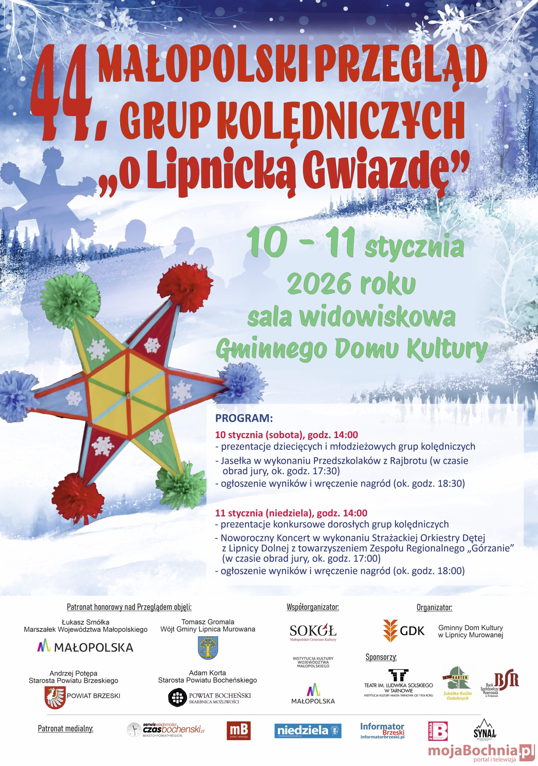 Gminny Dom Kultury w Lipnicy Murowanej serdecznie zaprasza na 44. Małopolski Przegląd Grup Kolędniczych „O Lipnicką Gwiazdę”, który odbędzie się w dniach 10–11 stycznia 2026 roku w sali widowiskowej Gminnego Domu Kultury w Lipnicy Murowanej.