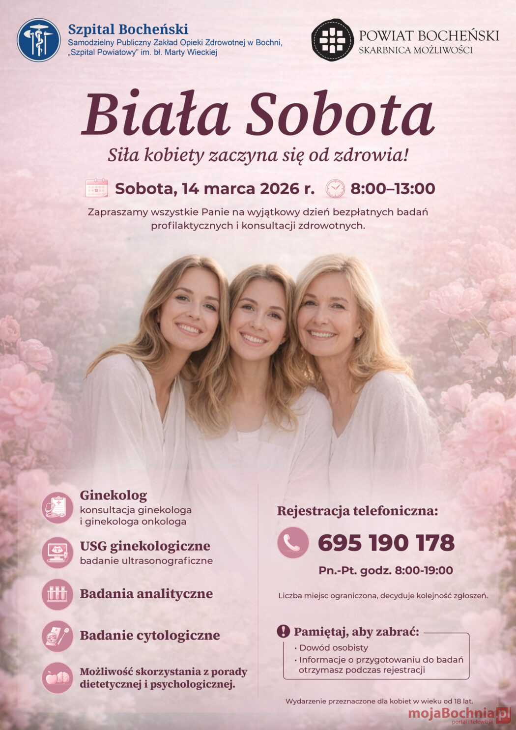 Już w sobotę, 14 marca 2026 r., w godz. 8:00–13:00 w bocheńskim szpitalu odbędzie się wydarzenie profilaktyczne pod hasłem „Biała Sobota – Siła kobiety zaczyna się od zdrowia!”. To dzień dedykowany wszystkim Paniom, które chcą zadbać o swoje zdrowie i skorzystać z bezpłatnych badań oraz konsultacji specjalistycznych.