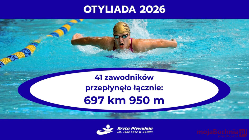 41 osób wystartowało w Bochni podczas XI Ogólnopolskiego Maratonu Pływackiego OTYLIADA 2026, który odbył się na Krytej Pływalni im. Jana Kota w miniony weekend (14/15 marca). W ciągu 12 godzin uczestnicy pokonali łącznie zawrotny dystans 697 km 950 m (blisko 28 tys. „25.metrowych basenów”).