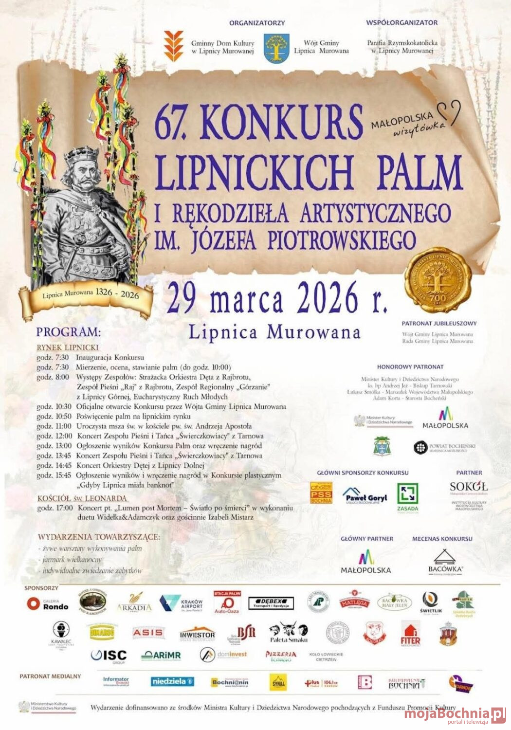 W Niedzielę Palmową 29 marca zapraszamy do Lipnicy Murowanej na najsłynniejszy w Polsce Konkurs Lipnickich Plam i Rękodzieła Artystycznego im. Józefa Piotrowskiego. To właśnie wtedy w szranki staną nieocenieni konstruktorzy palm, a ich wiklinowe dzieła dumnie wzniosą się nad lipnickim rynkiem.