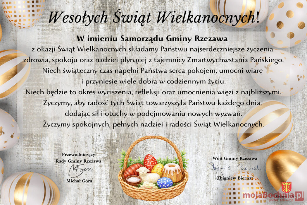Życzenia świąteczne od władz Gminy Rzezawa 3 kwietnia 2026 at 16:53 Władze Gminy Rzezawa: Wójt Zbigniew Biernat oraz Przewodniczący Rady Gminy Michał Góra przesyłają życzenia Wesołych Świąt Wielkanocnych!