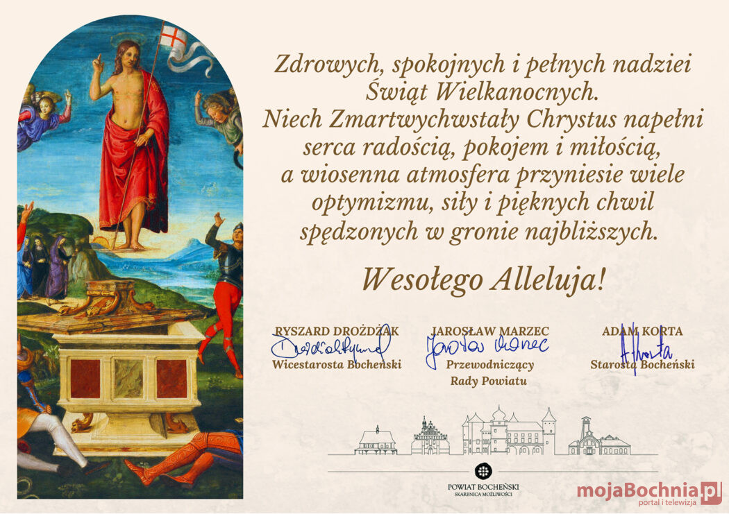 „Niech Zmartwychwstały Chrystus napełni serca radością, pokojem i miłością…” – życzenia z okazji świąt Wielkanocnych składają Starosta Bocheński – Adam Korta, Wicestarosta Bocheński – Ryszard Drożdżak oraz Przewodniczący Rady Powiatu – Jarosław Marzec.