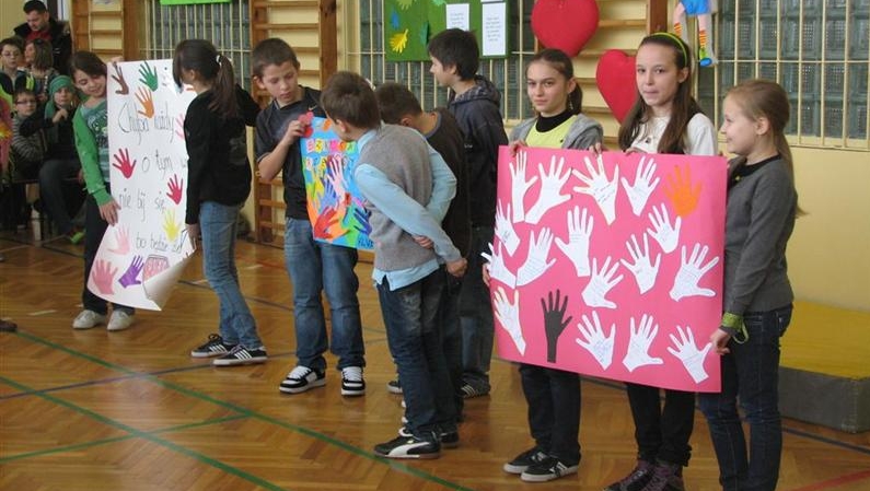 Uczniowie klasy IV A przedstawili krótką inscenizację pt. „Baśń o prawach dziecka”. Wykorzystano motywy ze znanych i lubianych przez dzieci bajek: „Kopciuszek”, „Czerwony Kapturek” i „Księżniczka na ziarnku grochu”. Samorząd Uczniowski zaproponował i wykonał „Hip-hopowy kodeks antyprzemocowy”. Dzieci korzystające ze Szkolnej Świetlicy zaprezentowały bardzo pomysłowy „Antyprzemocowy pokaz mody”. Na koniec zaproponowały hasło: „Nie proś świata, by zmienił się na lepsze. To Ty się pierwszy zmień”, oraz zaśpiewały piosenkę finałową „Daj na zgodę”. Występ młodych szkolnych aktorów bardzo się podobał i został nagrodzony gromkimi brawami.