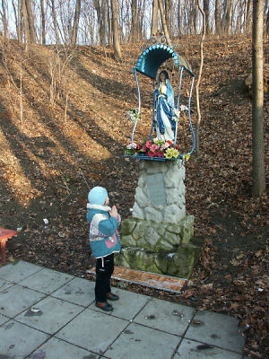 Kilkadziesiąt metrów dalej na zachód znajdziemy urokliwą dolinę leśną, w której na kamiennym postumencie stoi figura Najświętszej Marii Panny Niepokalanie Poczętej. Wzniesiona została ok. 1880 r. z fundacji Marii Maiss, jako wotum dziękczynne za uratowanie życia swego dziecka. Ta ładna figura znajduje się w jednym z wyrobisk gipsu. Jak bowiem wiadomo, na zachodnim zboczu Uzborni przez kilkadziesiąt lat działał kamieniołom i fabryka gipsu. Największy okres rozkwitu tego przedsiębiorstwa przypadł na lata 70-te XIX wieku, ale już w latach 20. XX w. gipsownię zamknięto. Jej istnienie upamiętnia nazwa biegnącej poniżej wzgórza ulicy oraz liczne wyrobiska i zagłębienia w zachodniej i południowej części Uzborni.